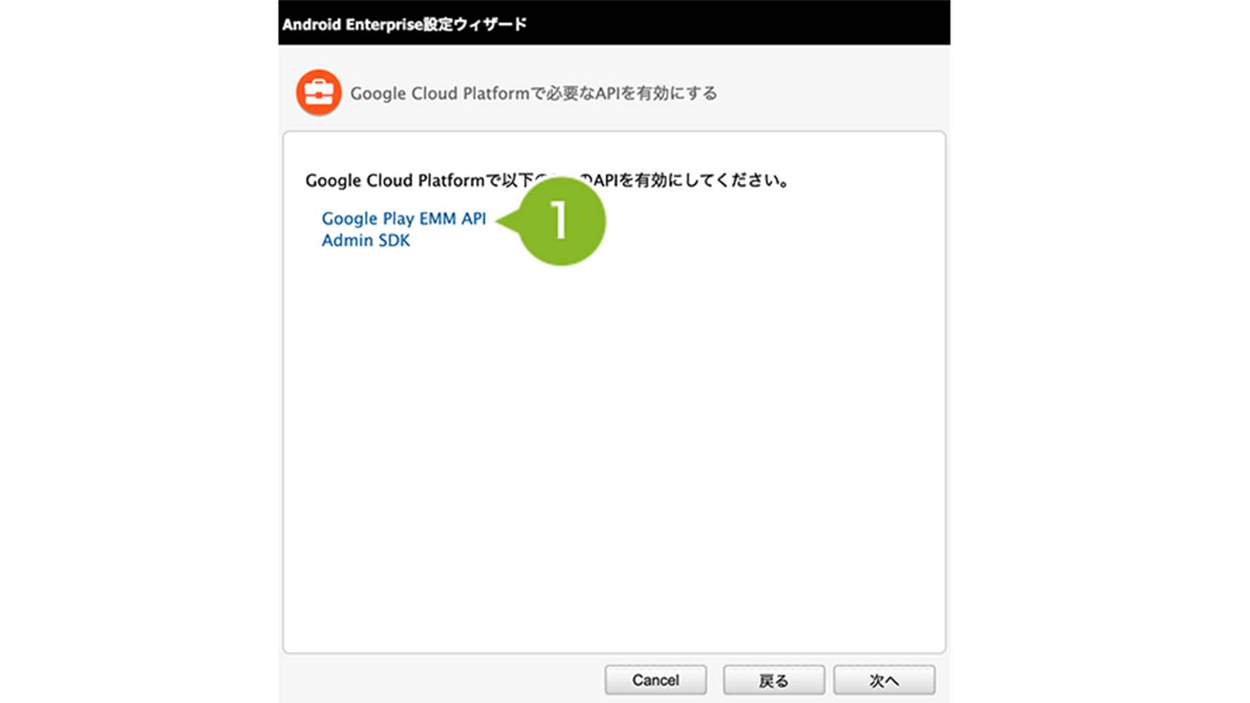 1. Android 設定ウィザードに戻り「次へ」を選択し、「Google Cloud Platform で必要な API を有効にする」画面の「Google Play EMM API」を選択します。
