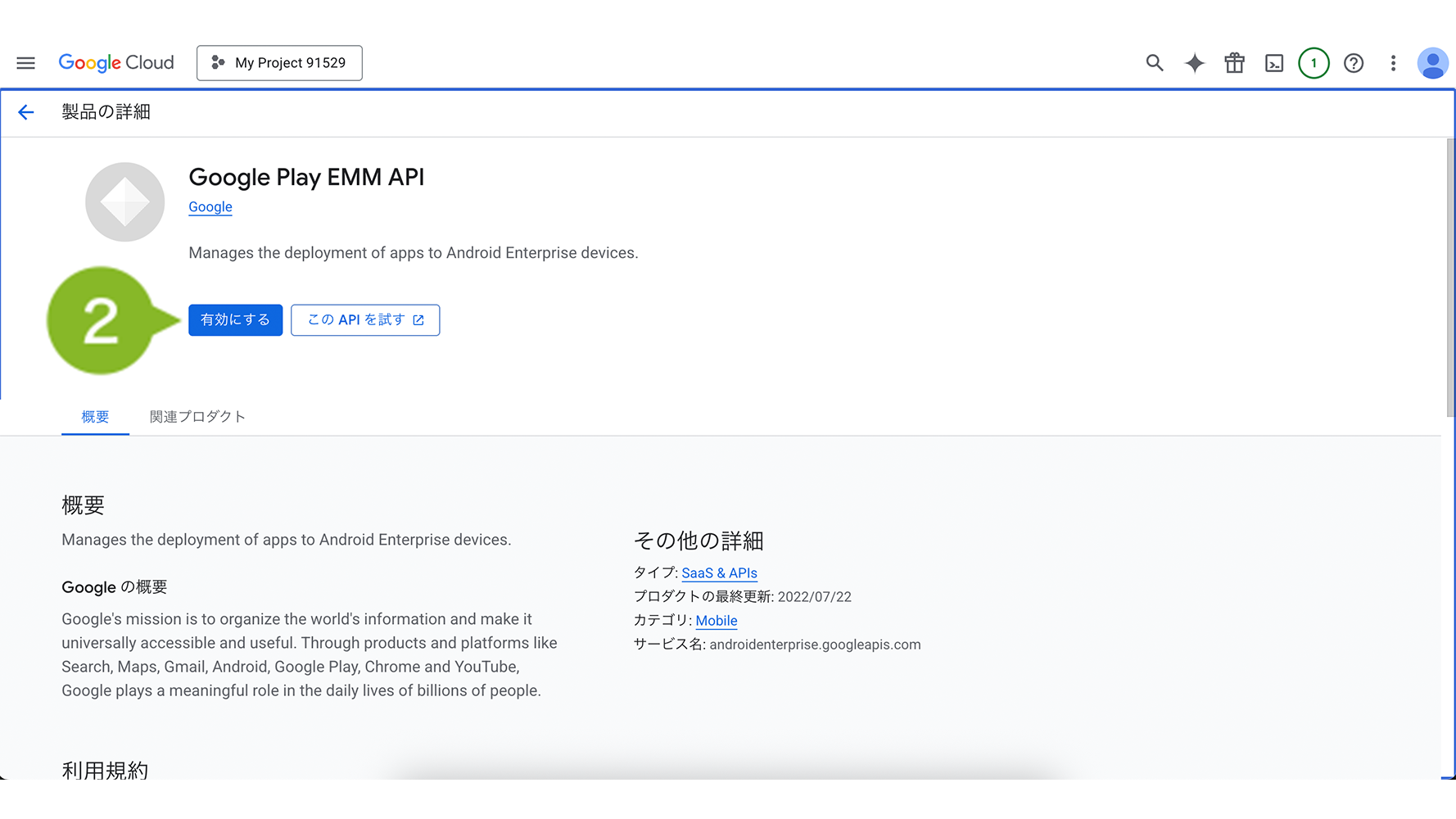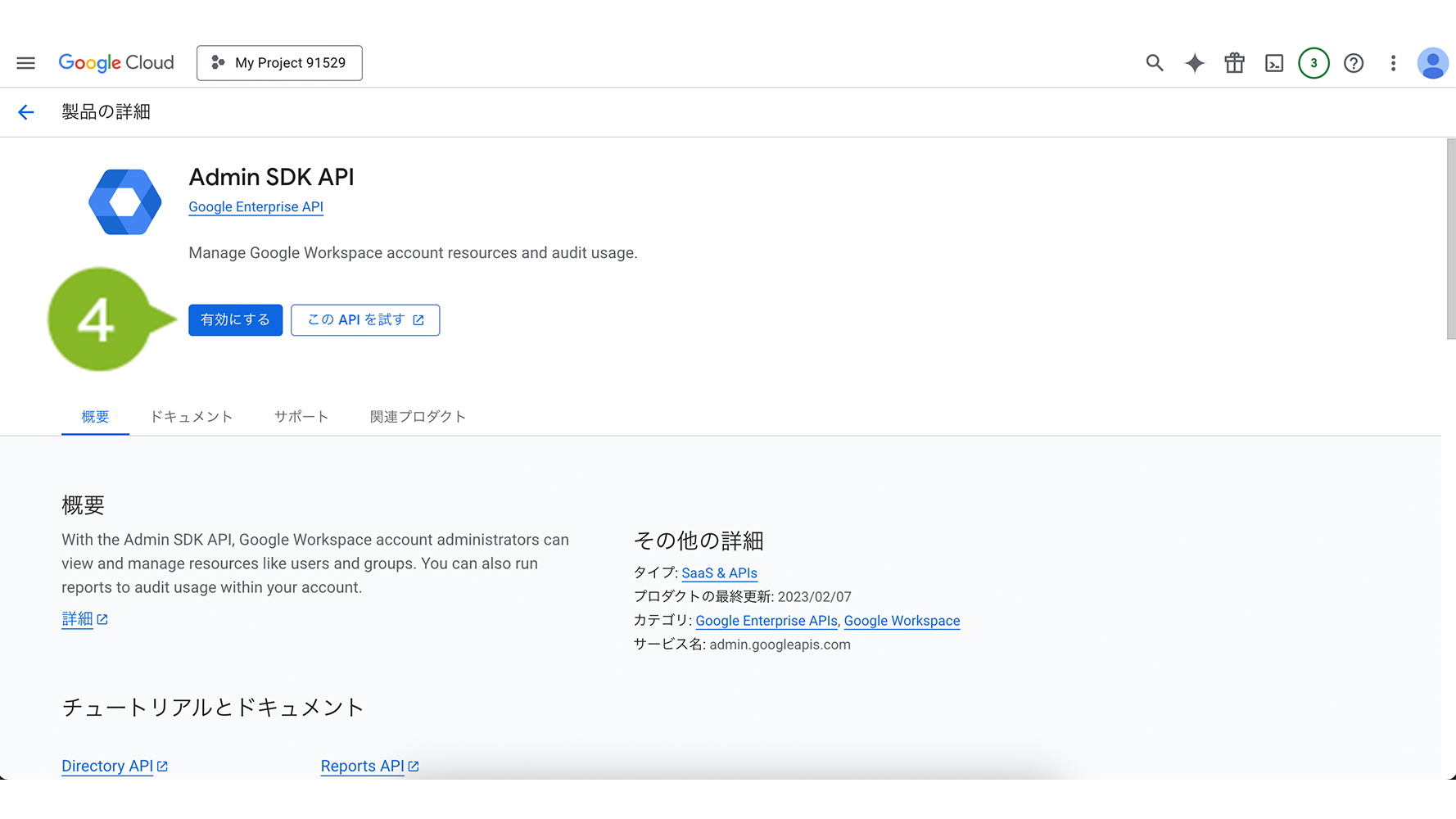 2. 画面左上のプロジェクト名が、「サービスアカウントを取得する」手順3で入力したプロジェクト名になっていることを確認した上で「有効にする」を選択します。