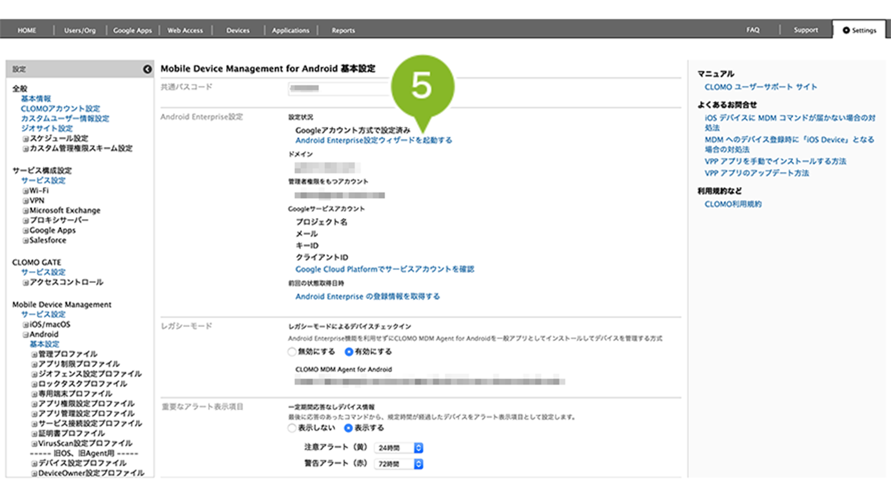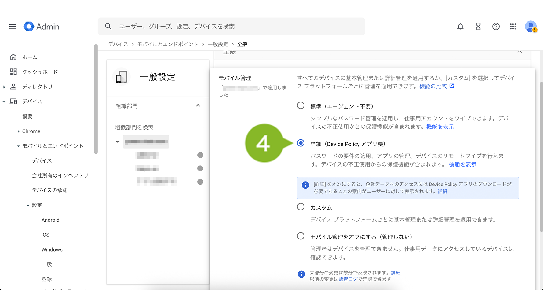 4. 「モバイル管理」から「詳細」を選択し、モバイル管理の有効化をします。