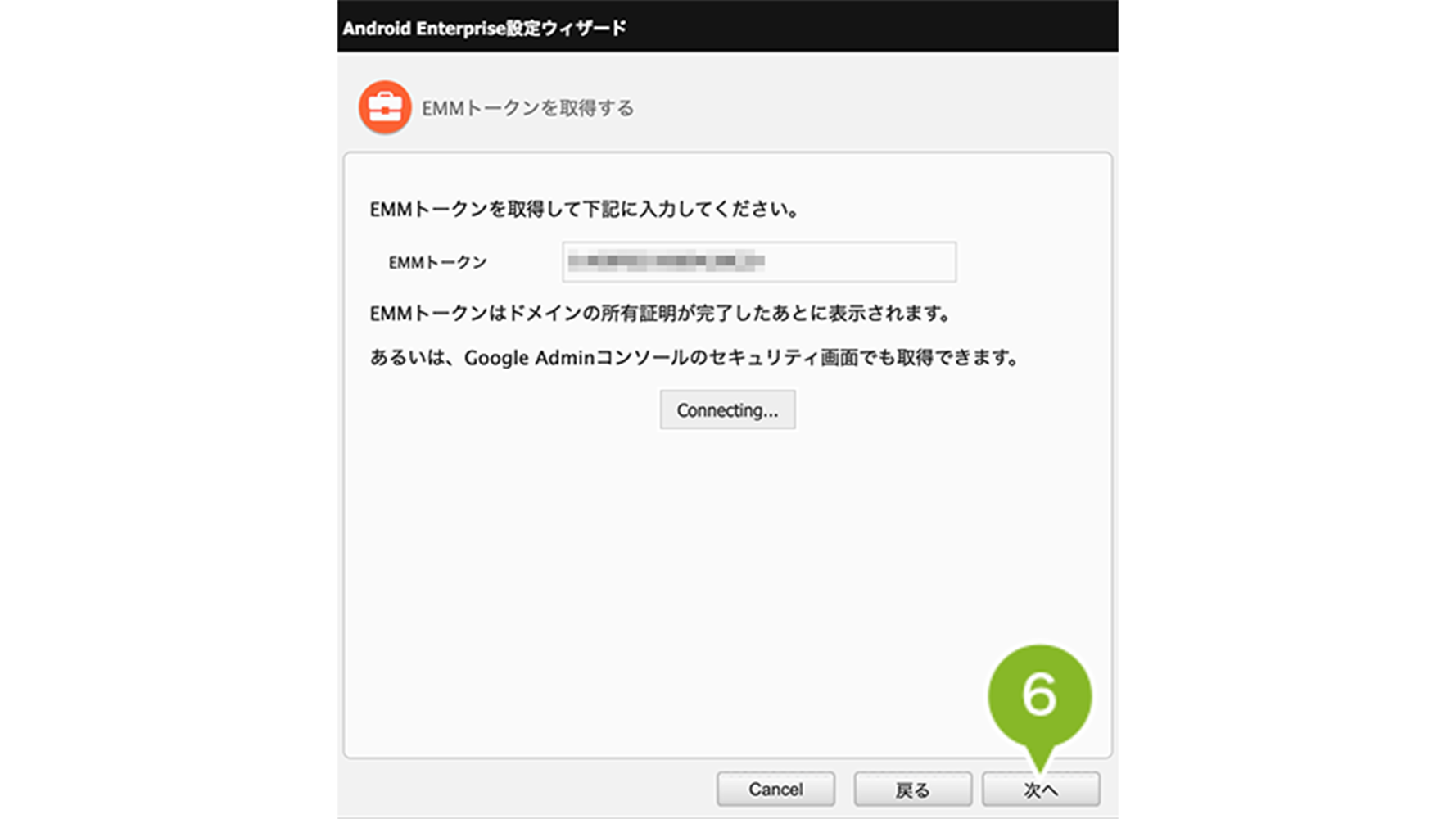 6. Android Enterprise 設定ウィザードに戻り、「EMM トークン」を入力し、「次へ」を選択します。