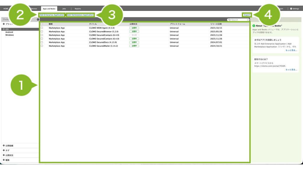 | 1 | アプリケーション選択画面 | Apps and Books に追加されたアプリケーションが一覧で表示されます。 iOS アプリの場合は、ここから公開状況の変更やアプリのインストール・アンインストール VPP アプリケーションライセンス数の確認や更新を行うことができます。 Android アプリの場合は、CLOMO からアプリへの権限の移譲を行うことができます。 |