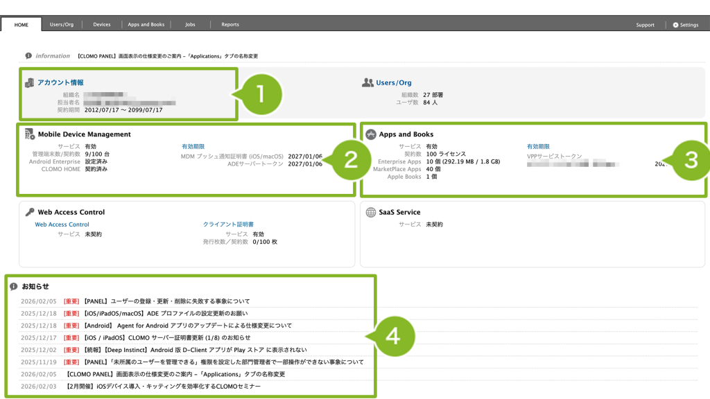 HOME 画面には、その環境の組織名や契約期間、登録されたユーザー情報、MDM の利用状況や証明書の有効期限などが表示されています。