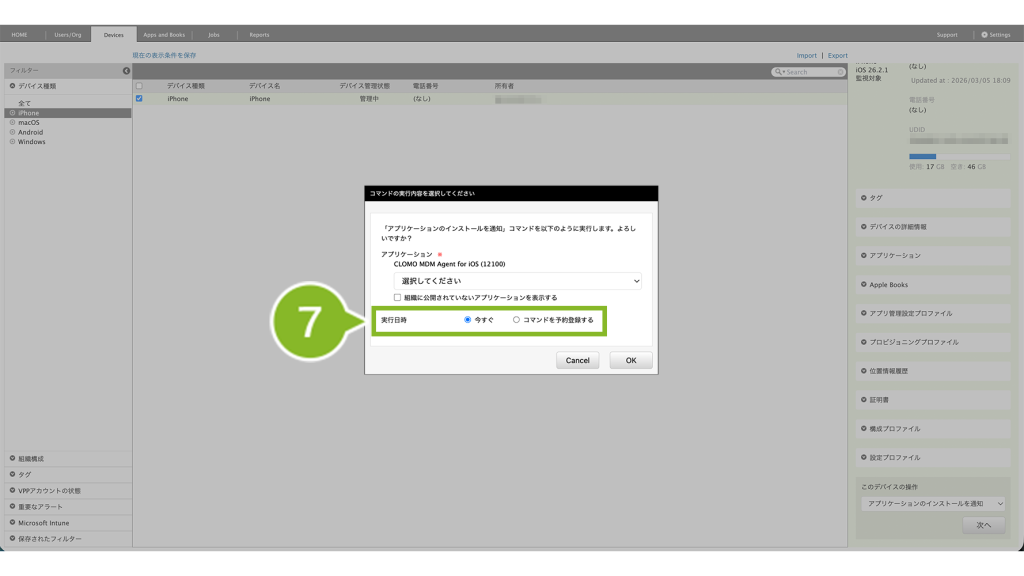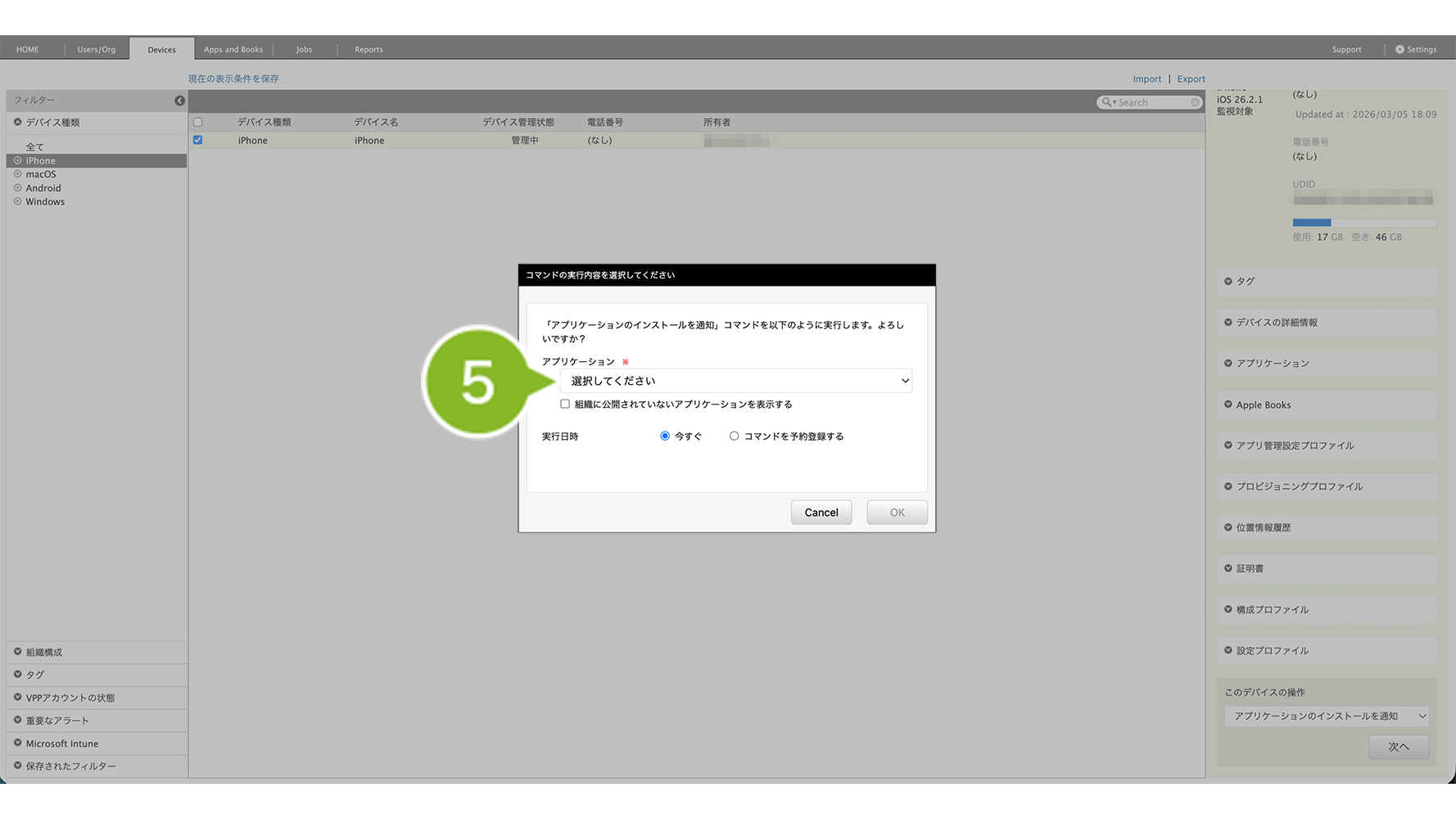 ※ iOS9以降のデバイスに対しては、MDM で管理されていないアプリ を MDM で管理されたアプリ へ変更する通知機能「アプリケーション管理状態への変更を通知」も表示されます。未インストールアプリケーションに対して同コマンドを使用した場合、「アプリケーションのインストール通知」と同じ挙動になります。