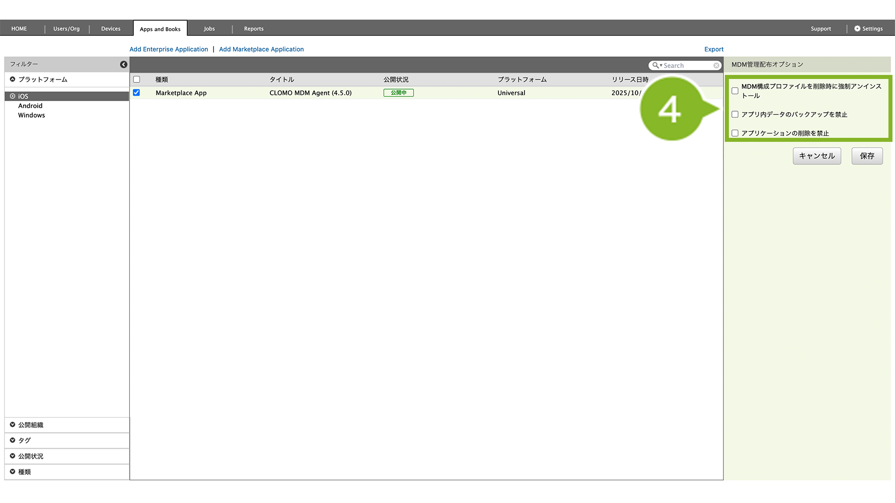 | - MDM 管理配布オプション | - MDM で管理されたアプリ |