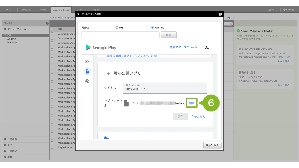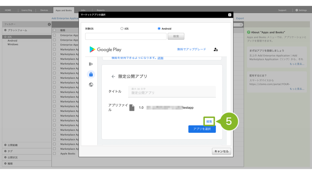 6. [編集]をクリックすると、アプリファイルの選択画面が表示されます。アップデートファイルを選択します。