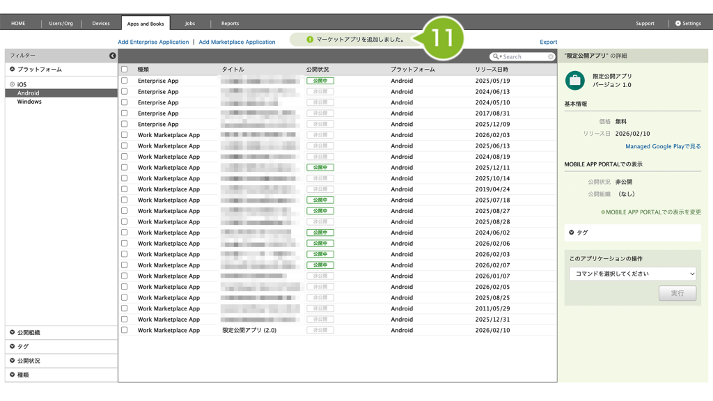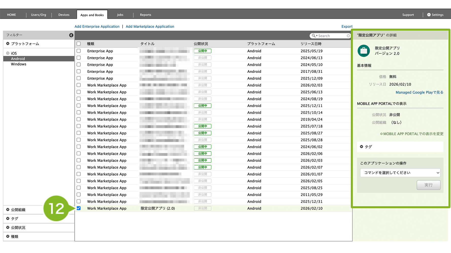 12. 対象の限定公開アプリを選択するとバージョンを確認することができます。