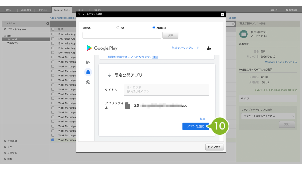 10. 10分程度経過後、再び限定公開アプリ画面を開き先の手順で設定した限定公開アプリを選択します。