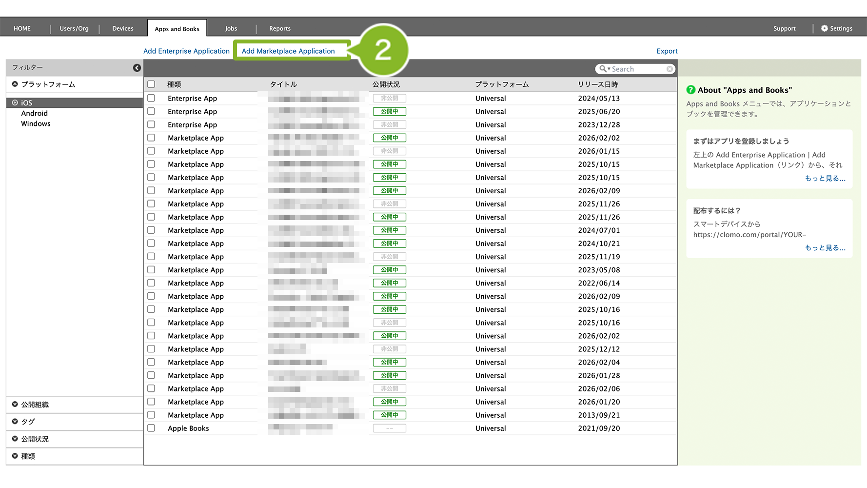 1. CLOMO PANEL にログイン後、[Apps and Books]をクリックします。