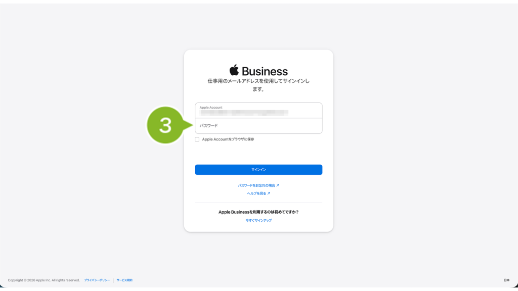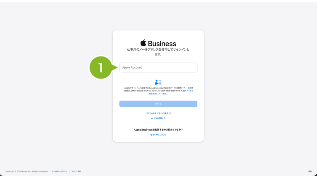 1. Apple Business(https://business.apple.com) へアクセスし、「管理者権限」もしくは「コンテンツマネージャ権限」をもつ Apple Account を入力します。