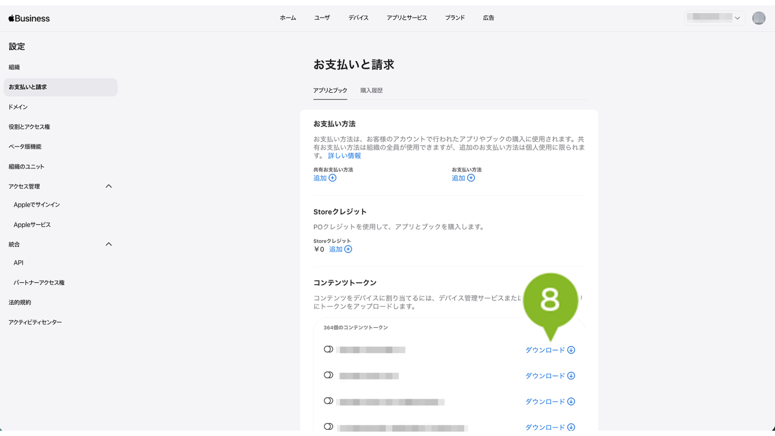 8. 「コンテンツトークン」から、アカウント作成時に設定したサーバの[ダウンロード]をクリックします。VPP サービストークンがダウンロードされます。