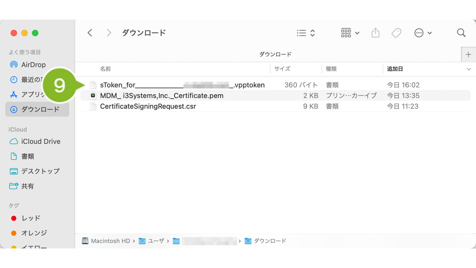 9. ダウンロードが完了したら、保存先のフォルダ内に VPP サービストークンが保存されていることを確認します。