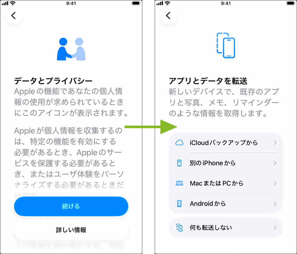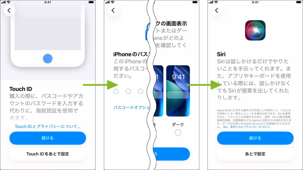 3. アクティベート完了後、デバイスに適用させた ADE プロファイルの「デバイス設定アシスタントで設定する項目」が順次表示されます。