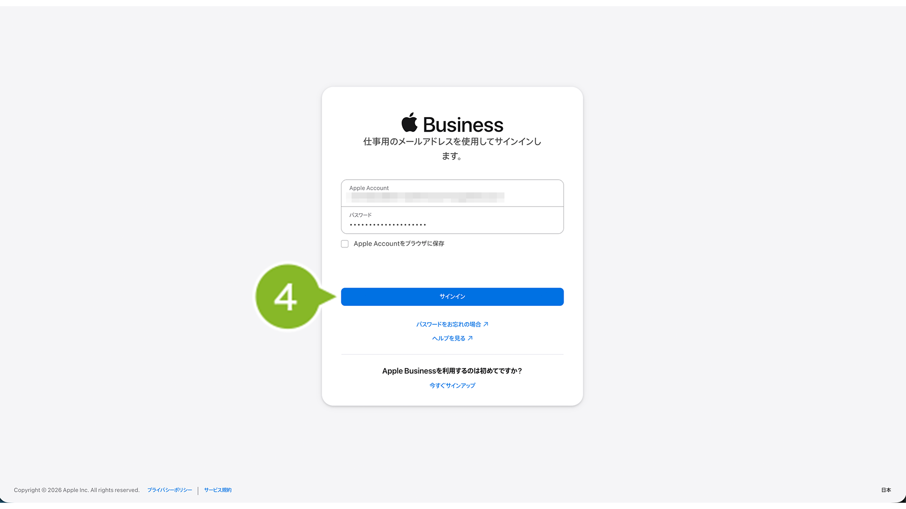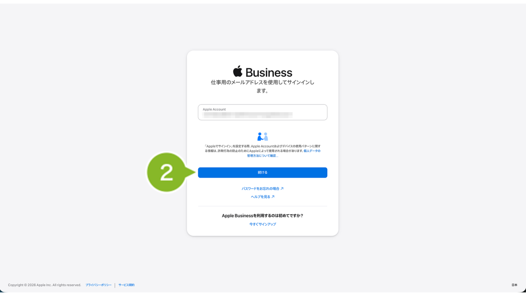 1. Apple Business へアクセスして、管理対象 Apple Account を入力します。