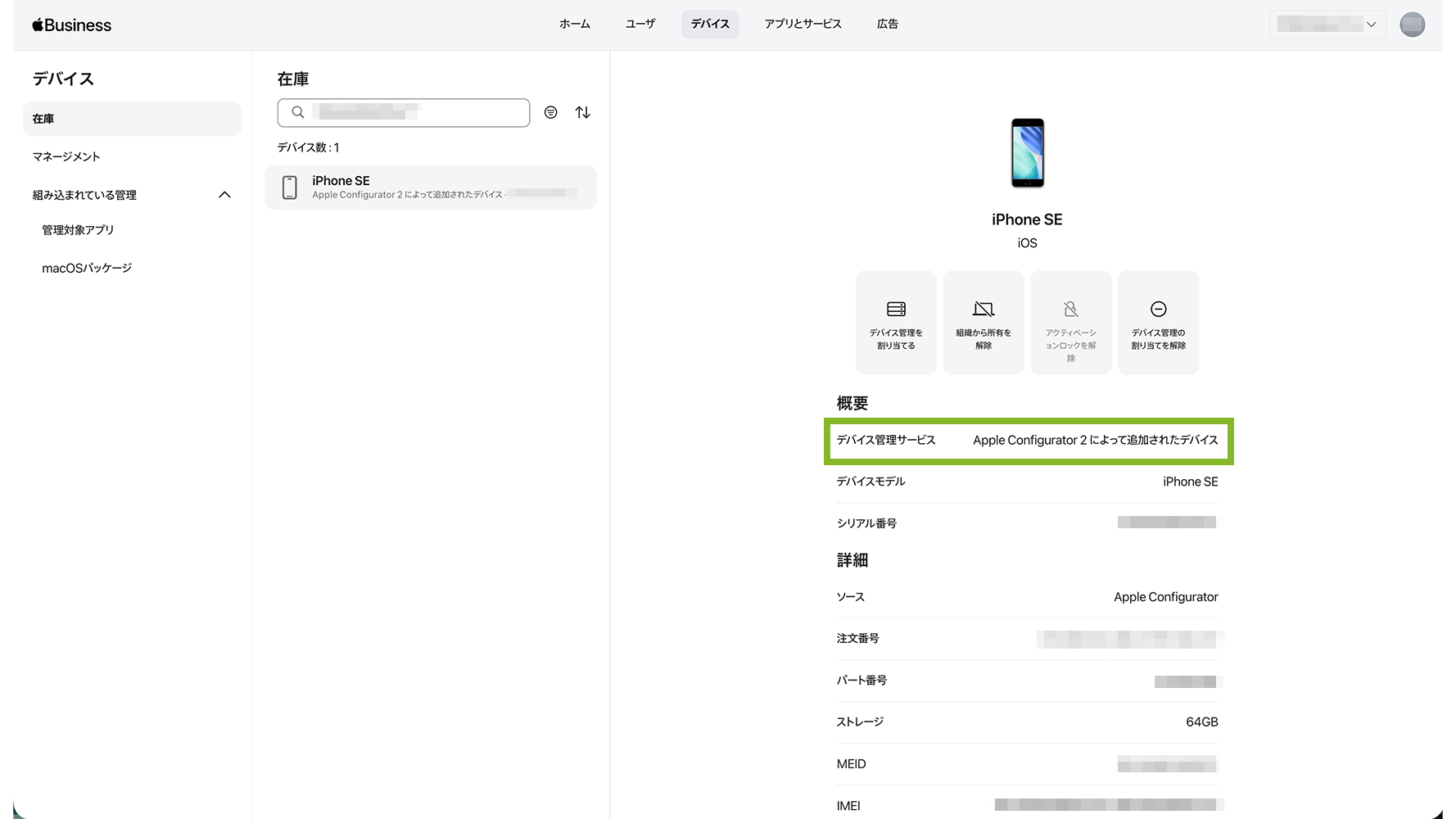 Apple Configurator for iPhone からの ADE デバイスのチェックインは、Apple Business において「Apple Comfigurator 2で追加したデバイス」という項目の下に追加されるため、通常利用している ADE 管理サーバの配下にデバイスが登録されません。