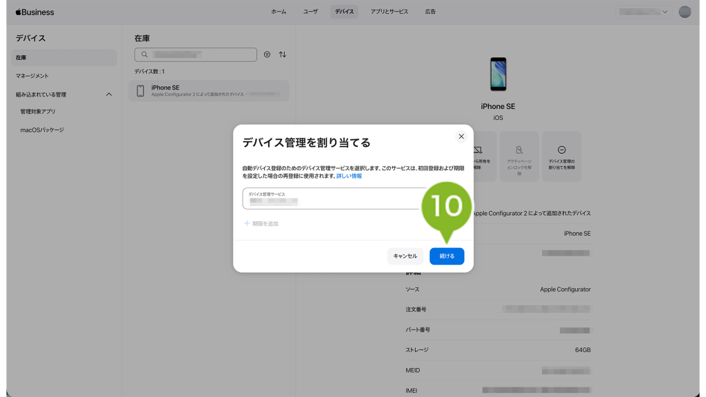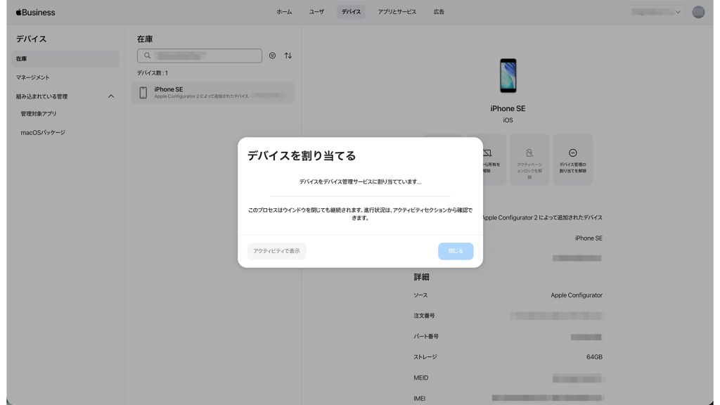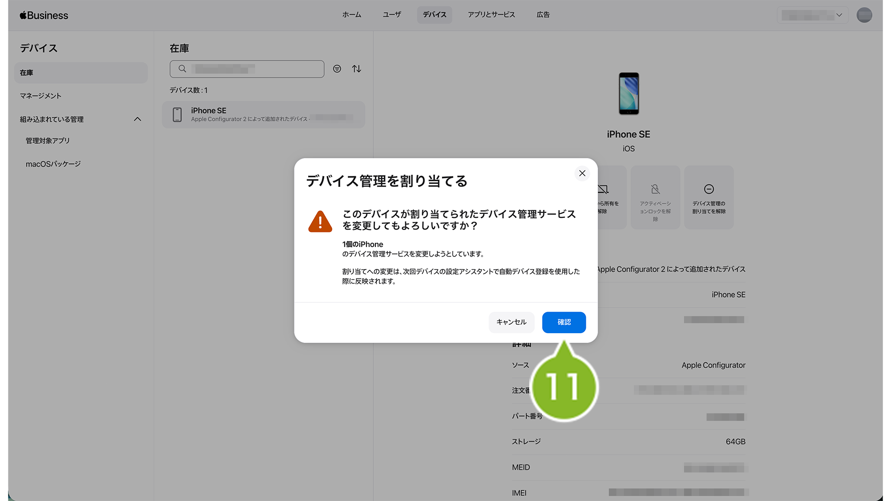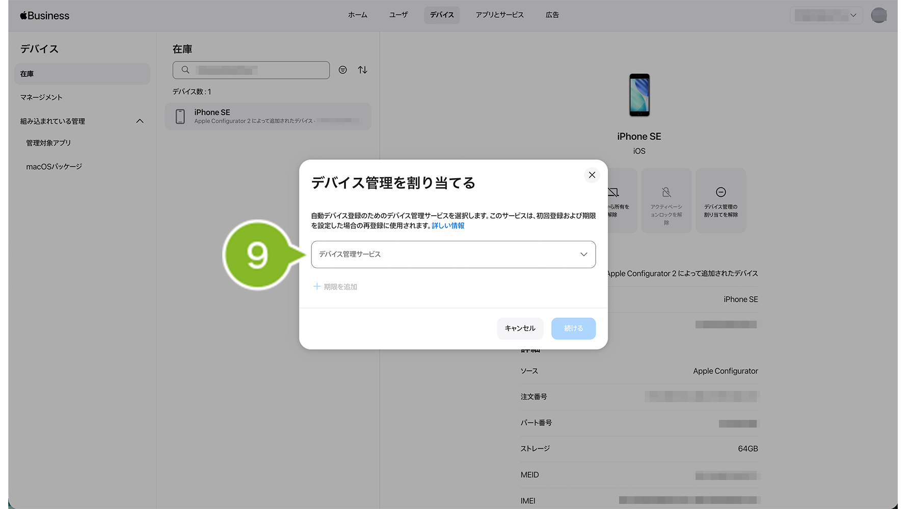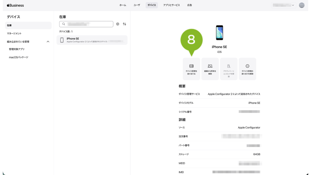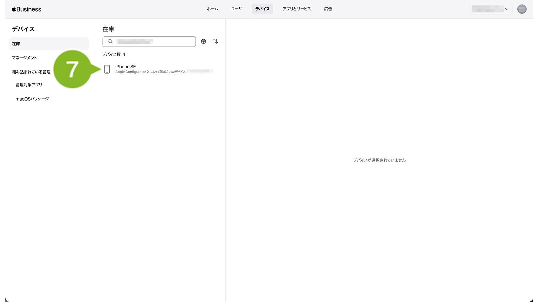 iOS 17以前のデバイス、もしくは Apple Configurator for iPhone で「MDM サーバ割り当て」を実施していない場合は Apple Business でデバイスにサーバ割り当てをおこなってください。