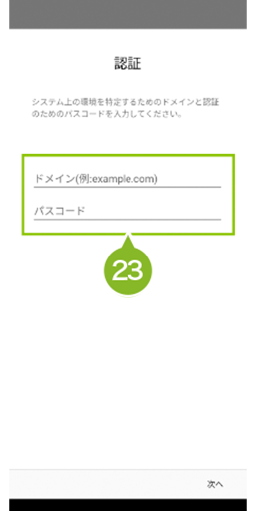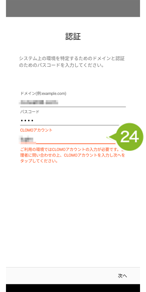 23. CLOMO 利用ドメイン 名とパスコードを入力し、「次へ」を選択します。
