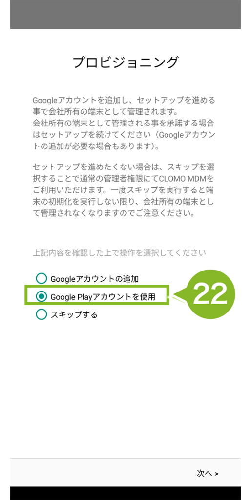 22. プロビジョニング画面に移ります。「Google Play アカウントを使用」を選択し、「次へ」を押してください。