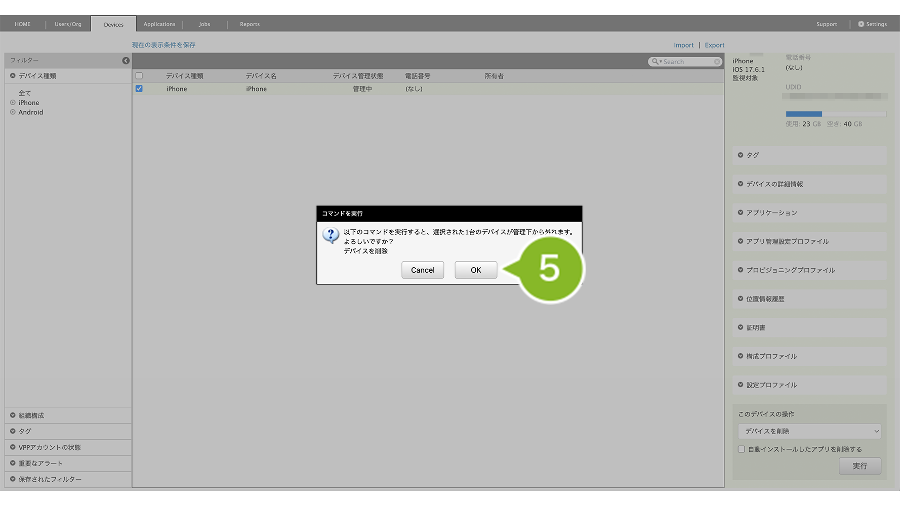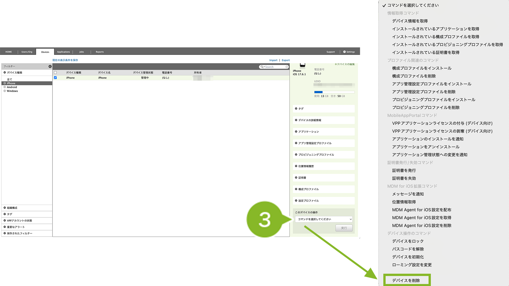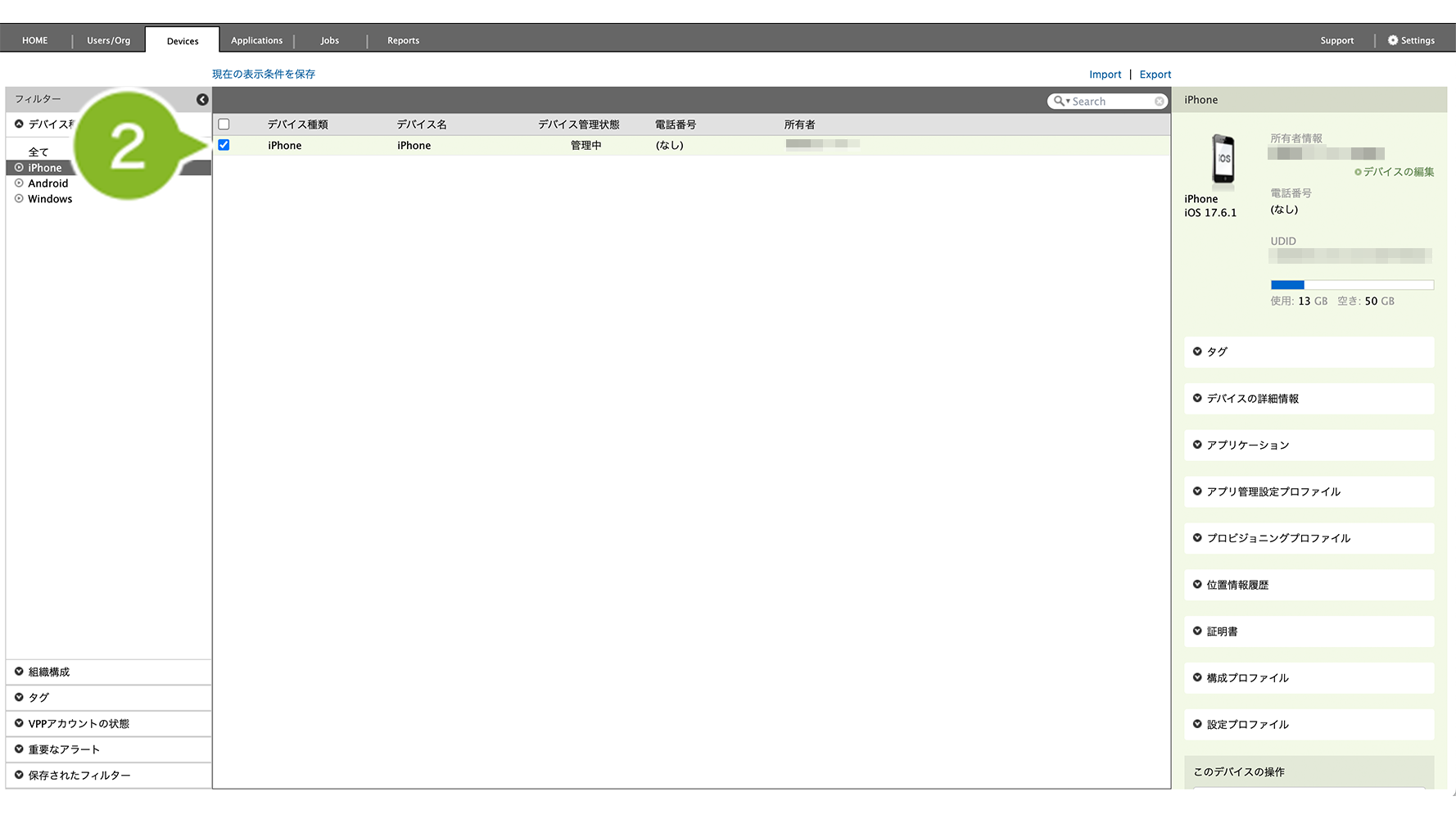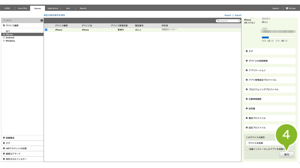 1. Devices 画面で削除したい iOS デバイスを選択します。複数選択や一括選択も可能です。