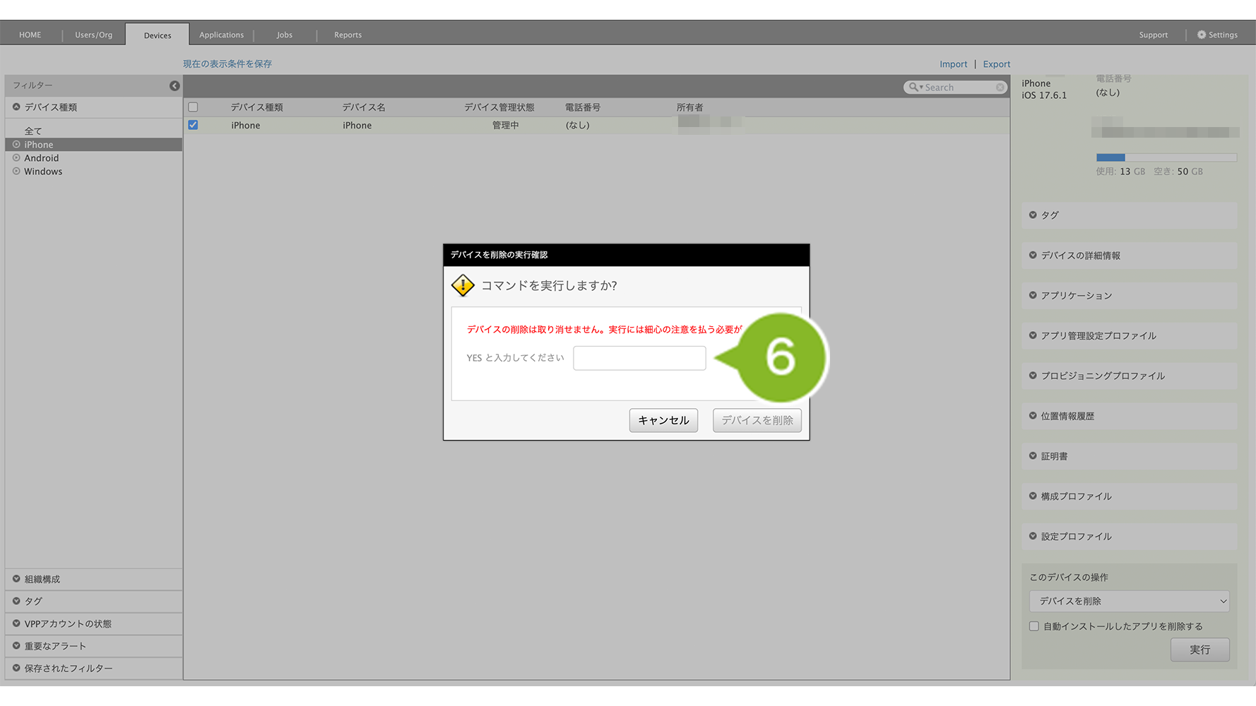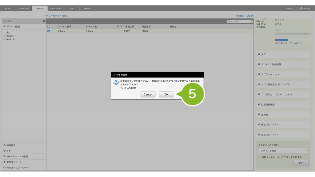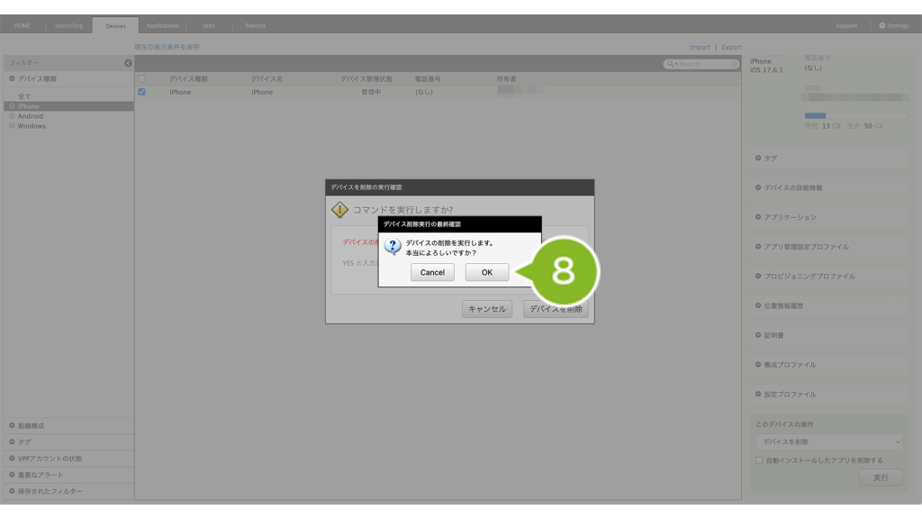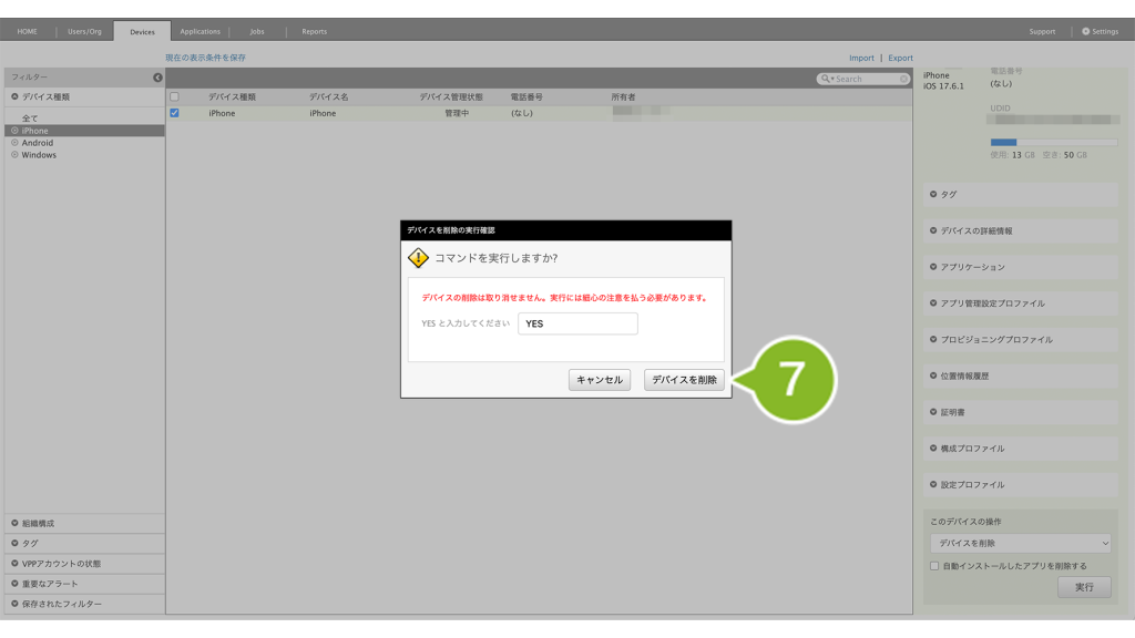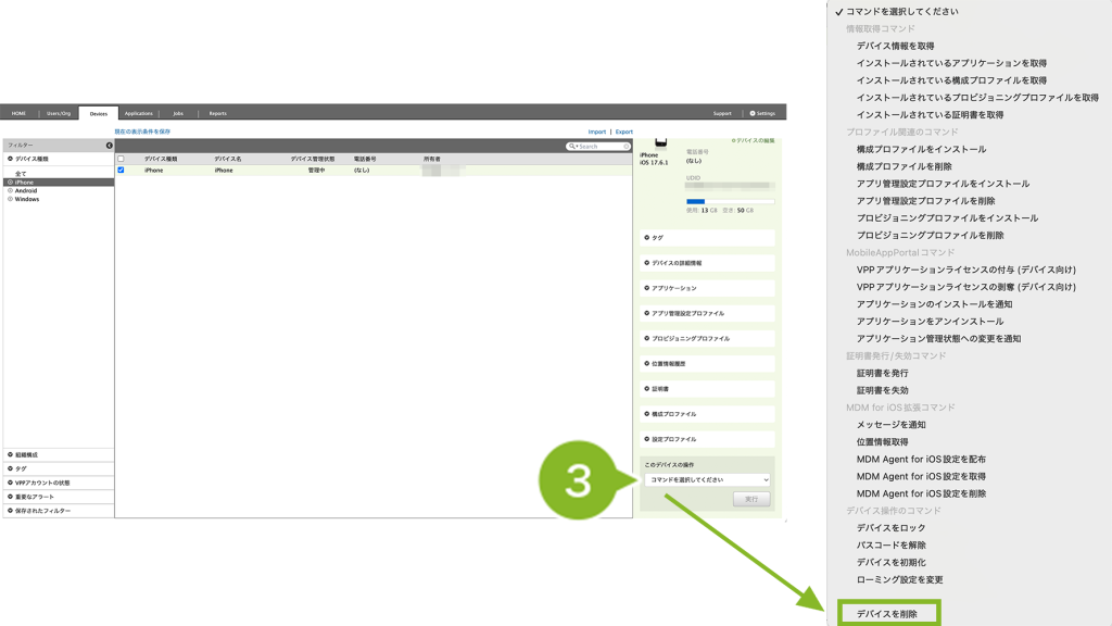 削除するデバイスにVPP ライセンスを付与している場合は、VPP ライセンスの剥奪を実行しないとデバイス情報を完全に削除できません。