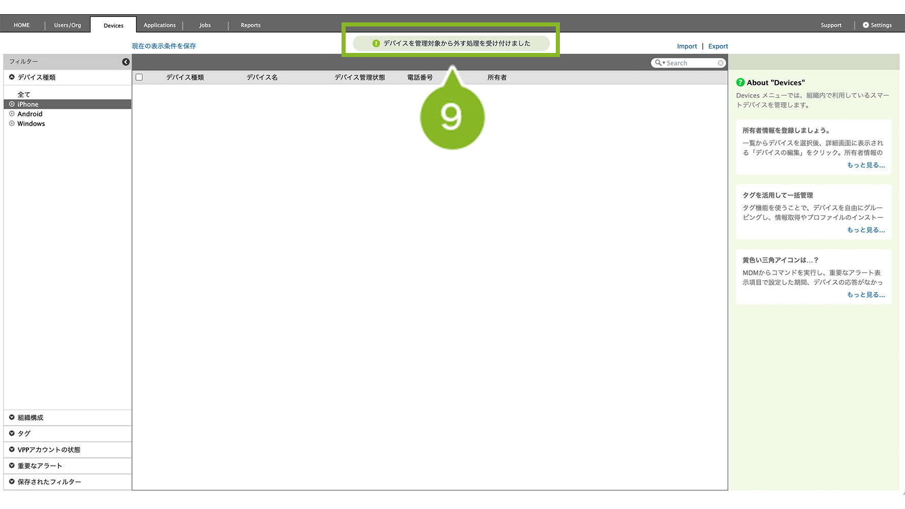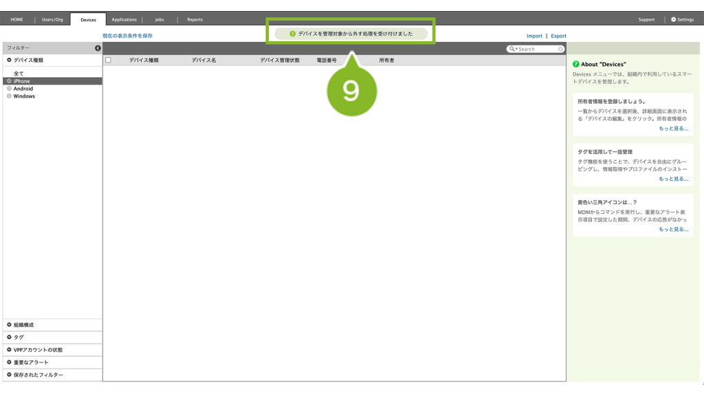 9. 削除を受け付けたお知らせが表示されます。しばらくすると、デバイスが管理下から外れて Devices 画面の一覧に表示されなくなります。