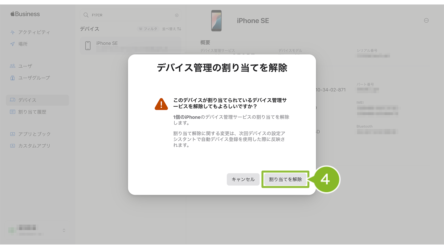 「割り当てを解除」は、特定の MDM サーバーからの割り当てを解除し、一時的に ADE デバイスとして扱わなくする場合や、別の MDM サーバーへ再割り当てする際に実施します。