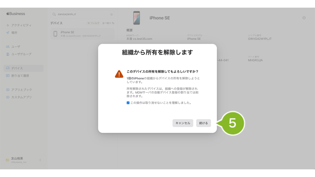 一方、「組織から所有を解除」は、ABM や ASM から対象デバイスを削除する操作です。ABM や ASM の利用規約に従い、所有または管理していないデバイスは所有解除を行う必要があります。