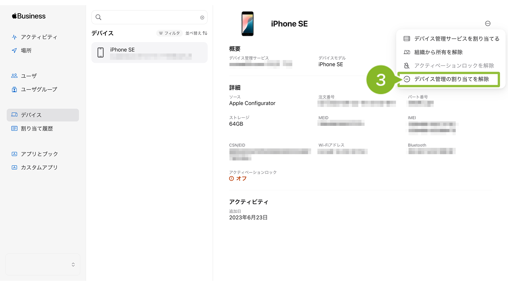 削除する方法は、「割り当てを解除」と「組織から所有を解除」の2パターンがあります。運用に合わせてどちらかを実施してください。