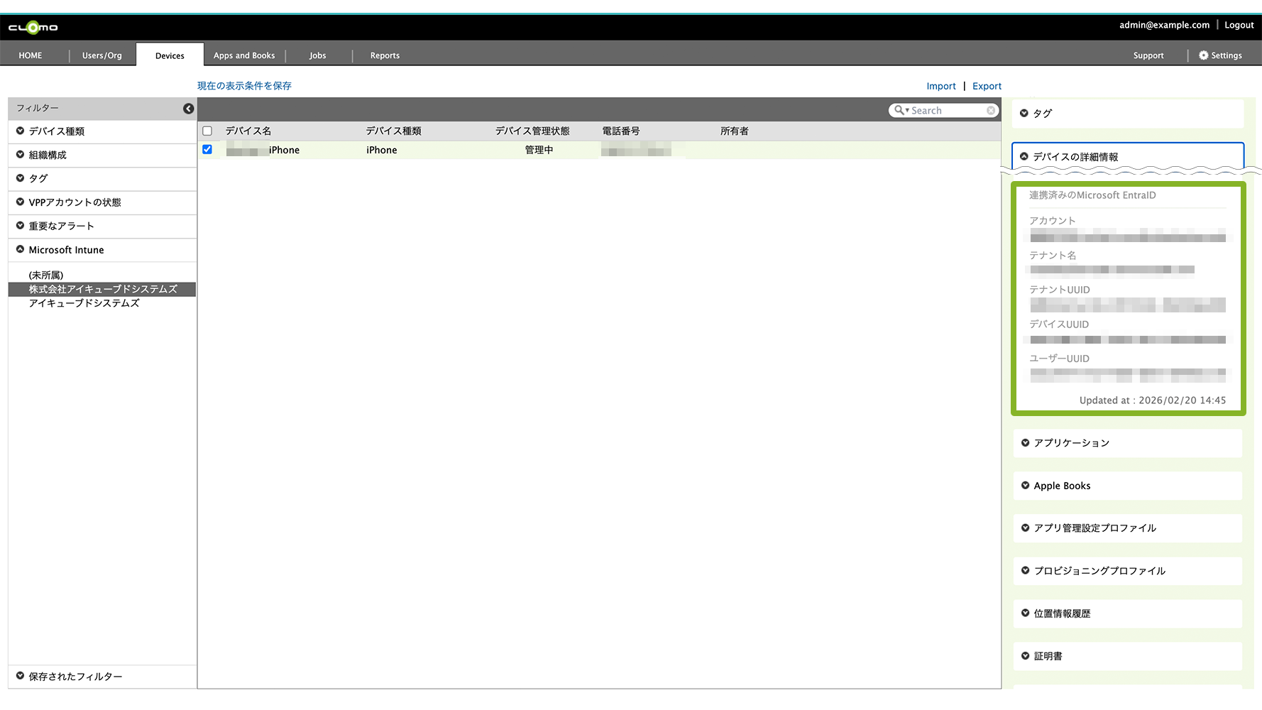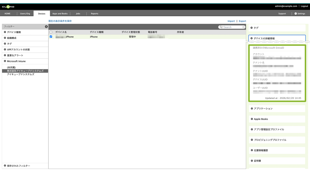 CLOMO PANEL では、Devices 画面で該当デバイス選択後の「デバイス詳細情報」に連携情報が表示されます。