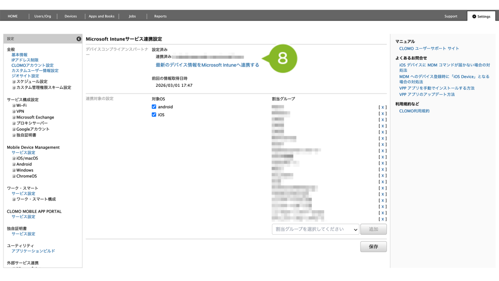 8. 「Microsoft Intuneサービス連携設定」画面で「連携済み」となっていれば Microsoft Intune への接続が完了したことが確認できます。