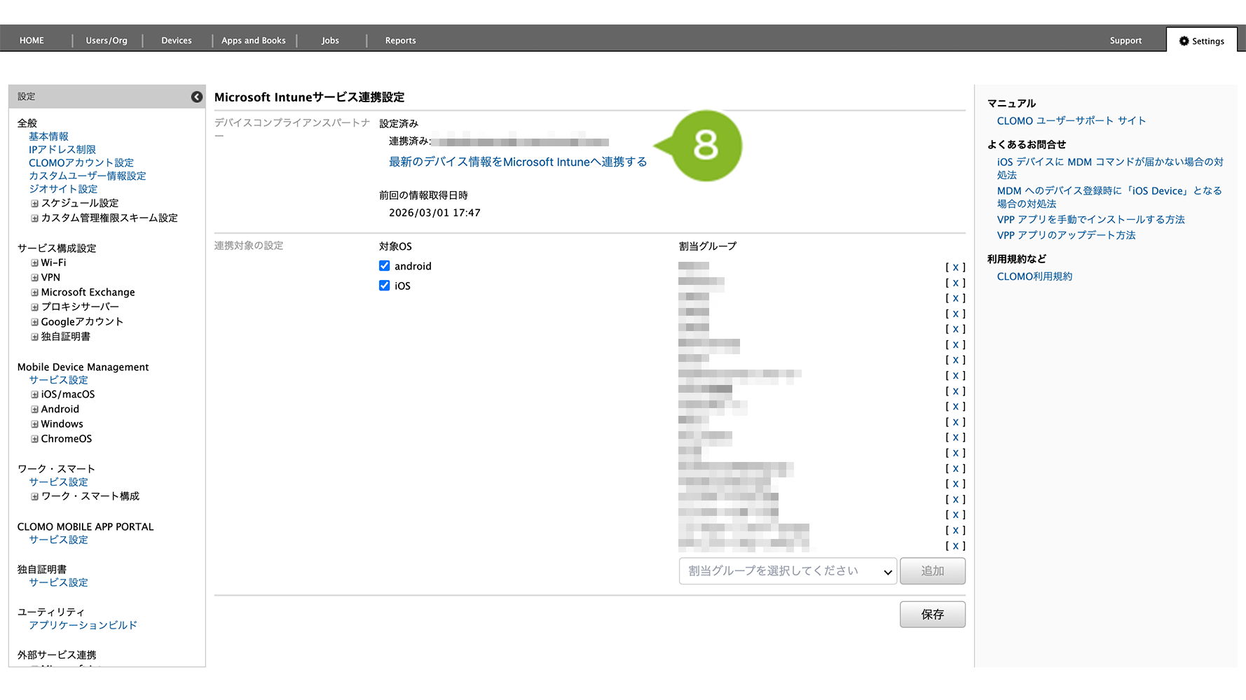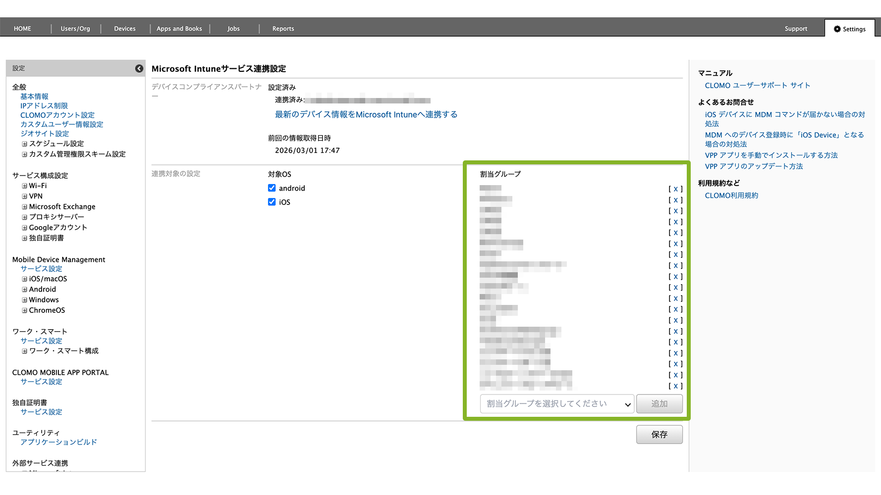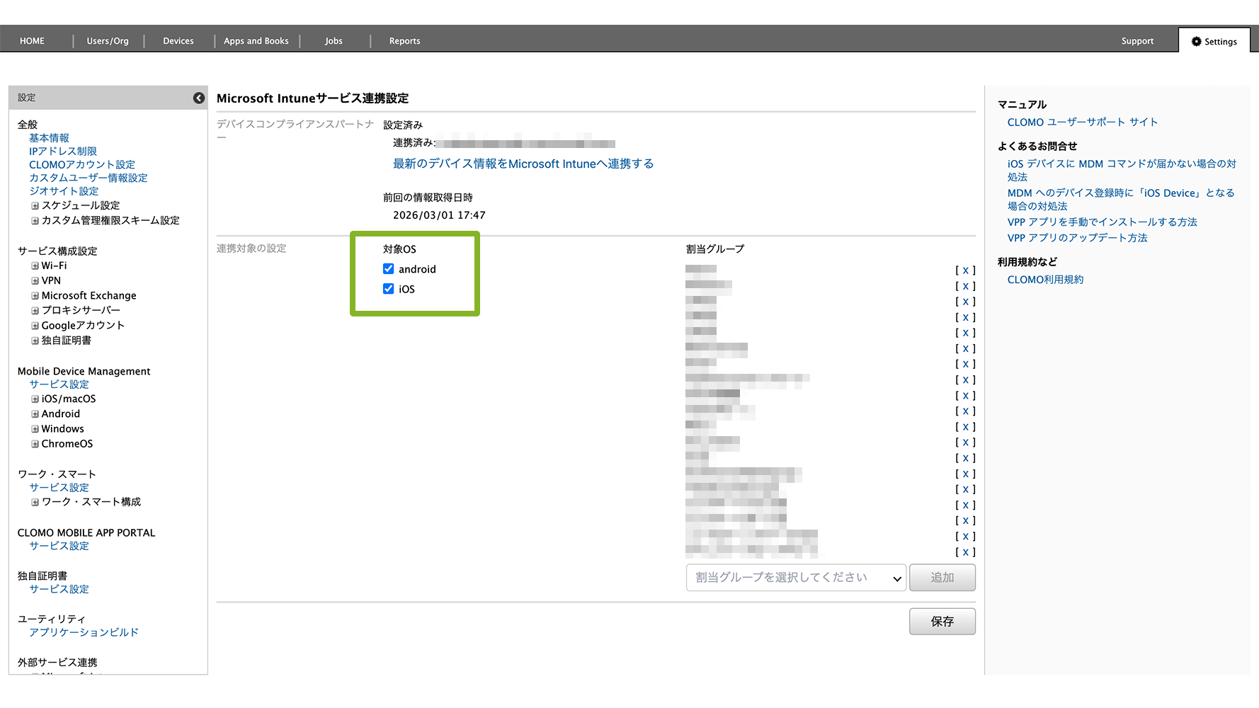 Microsoft Intuneサービス連携設定画面の連携対象設定の項目を確認をします。