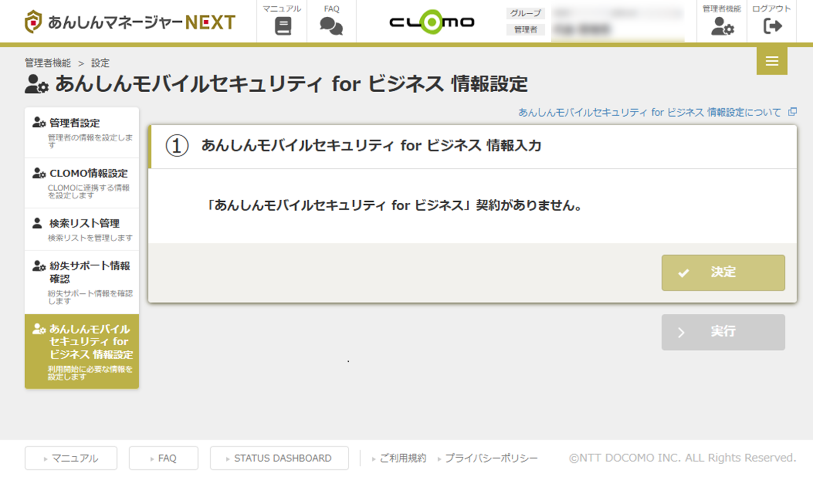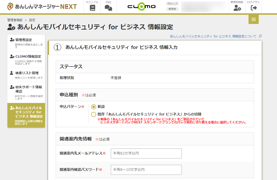 「あんしんモバイルセキュリティ for ビジネス」の情報登録は、ビジネスサポートパック NEXT スタンダードプランのご契約がある場合に登録可能です。