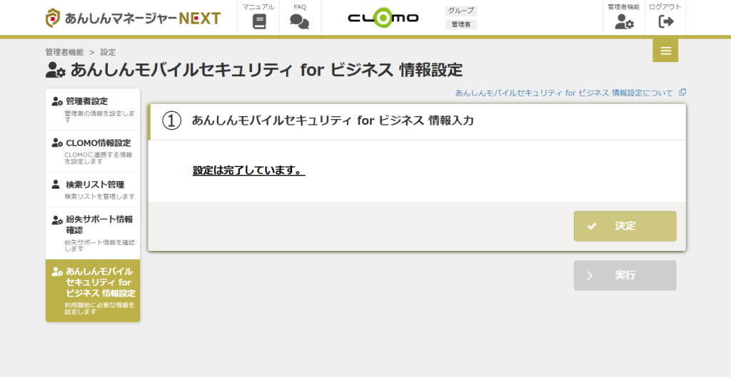 あんしんモバイルセキュリティ for ビジネスの環境作成が完了すると本画面で入力した内容は表示されなくなります。