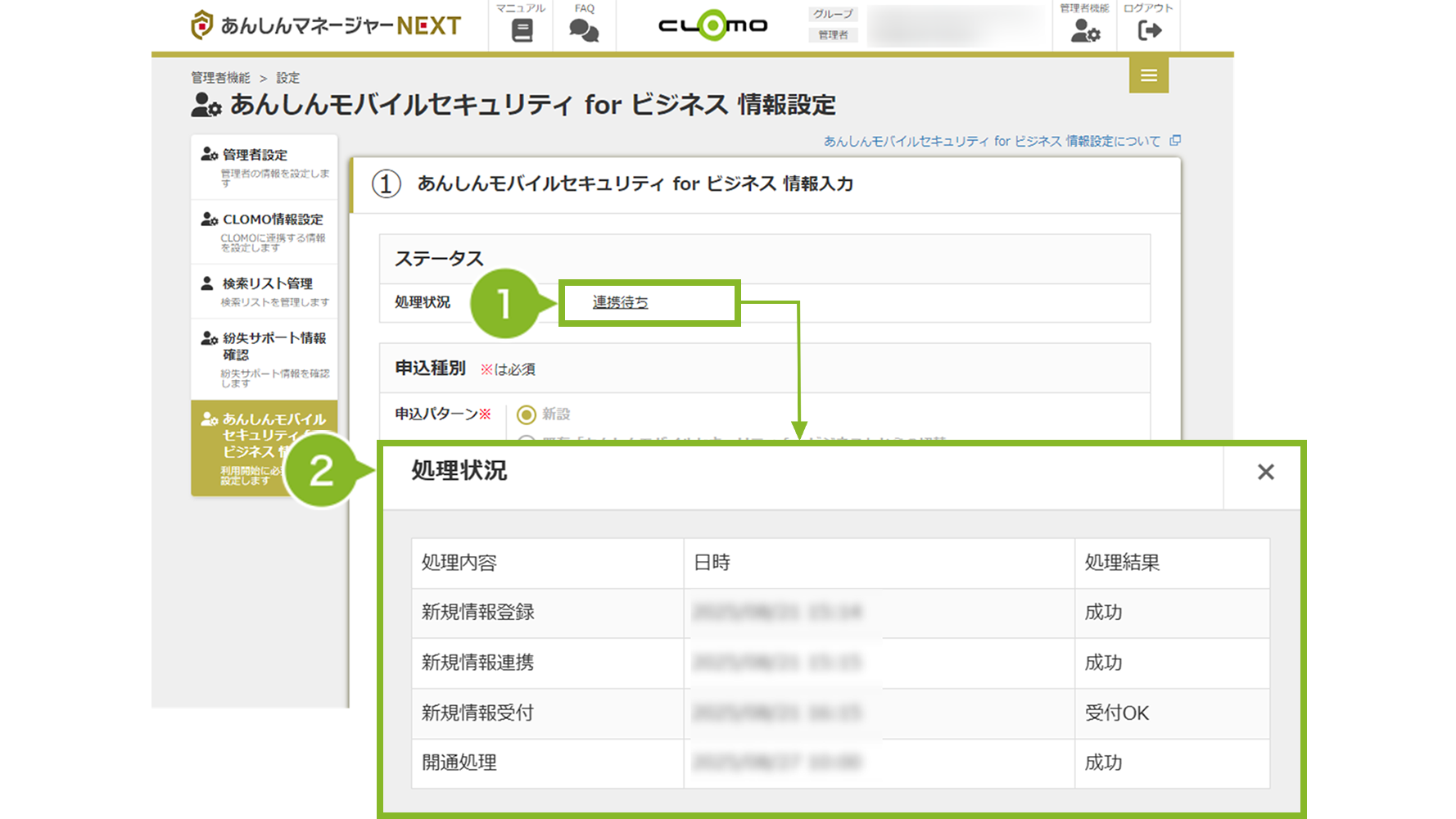あんしんモバイルセキュリティ for ビジネス情報を登録すると、処理状況に応じてステータスが変化します。