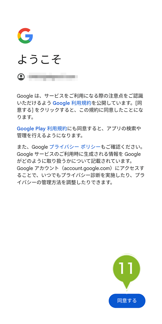 11.Google サービス画面が表示されたら内容を確認して「同意する」を選択します。