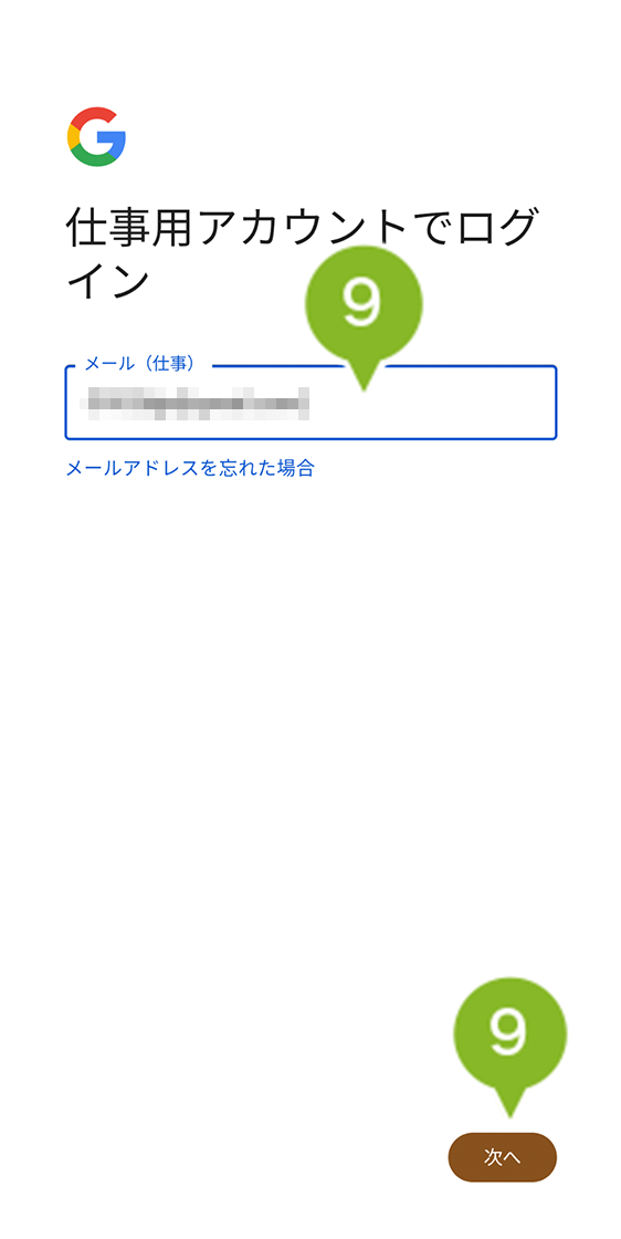 9. Google アカウントのメールアドレスを入力して、「次へ」を選択します。
