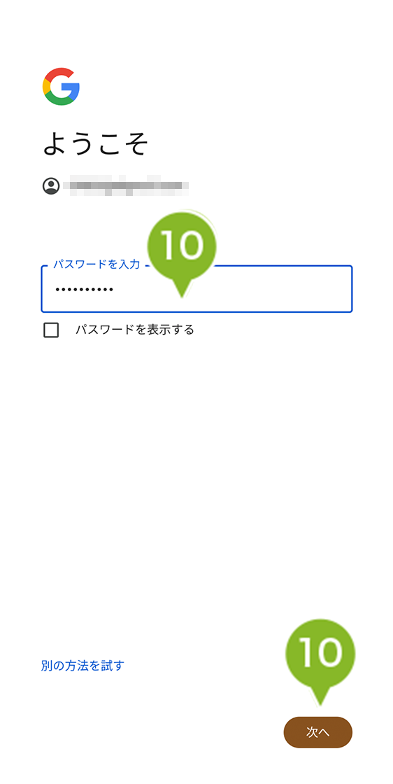 9. パスワードを入力し、「次へ」を選択します。