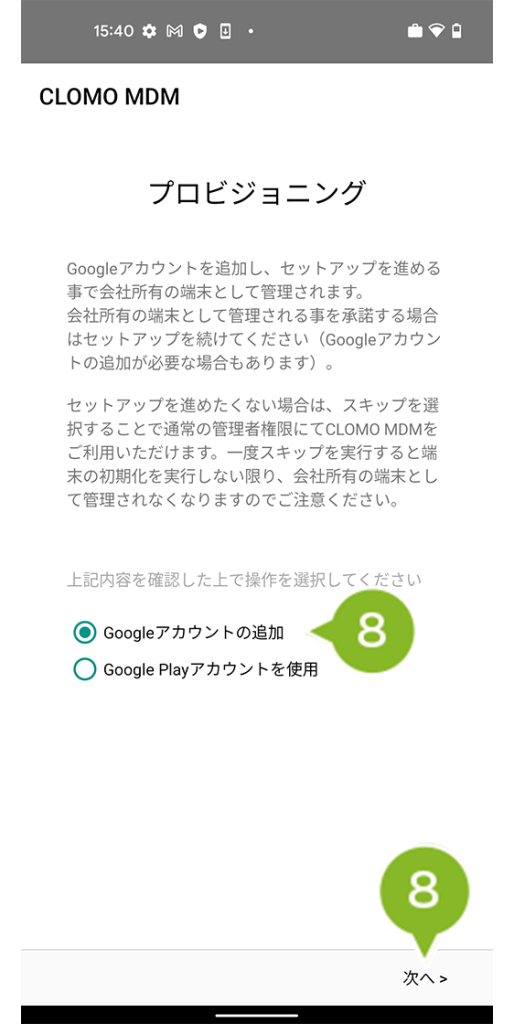 8. プロビジョニングが表示されたら、「Google アカウントの追加」を選択して次へ進みます。