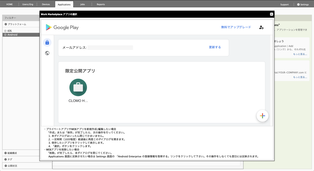 | アプリの登録方法 | CLOMO PANEL > Applications タブ >「Manage Android Private Apps」からアプリを登録 Managed Google Play に apk ファイルをアップロードします |