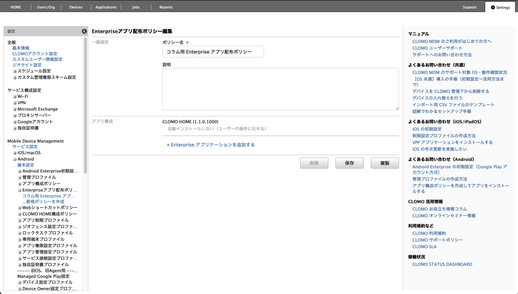 CLOMO PANEL 上の Enterprise アプリ配布ポリシー設定画面