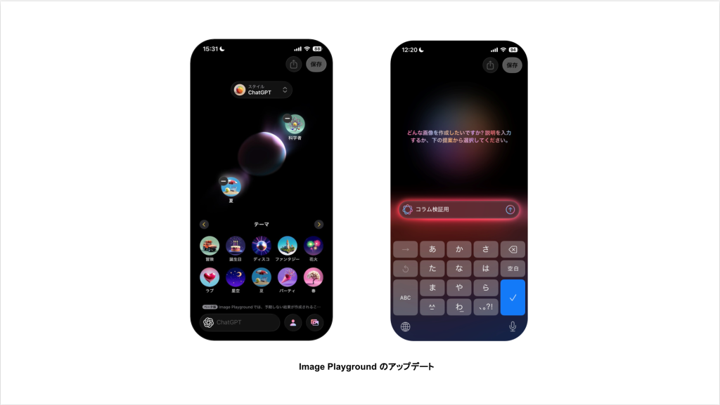 • 概要:Image Playground では、新しい ChatGPT スタイルやジェン文字を活用し、家族や友だちの写真をもとに自由度の高い画像生成を楽しむことができます。