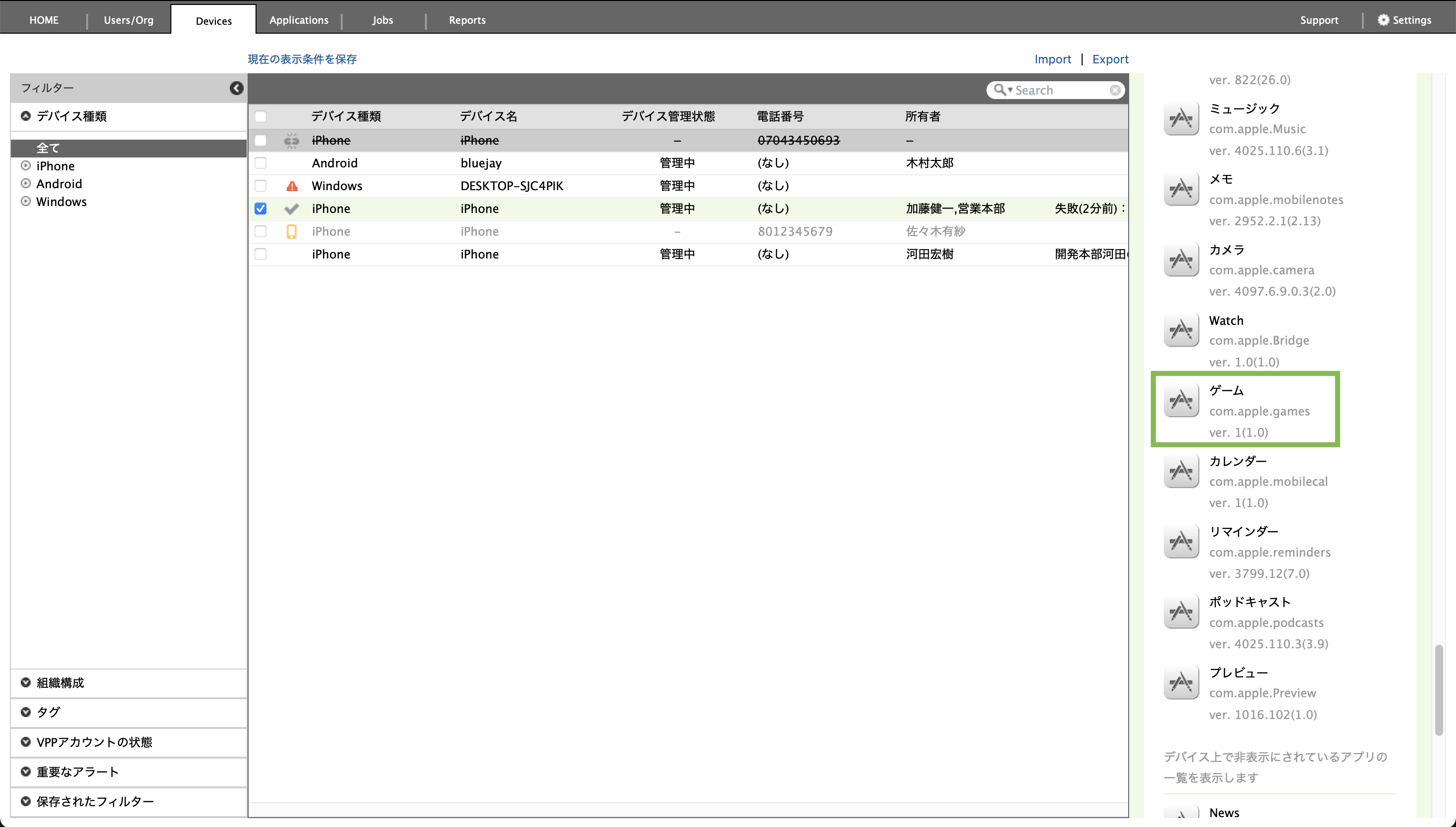 また、App ID の入力についてご不明な場合は、以下の Devices 画面内の「アプリケーション」欄よりご確認いただけますので、ご参照ください。