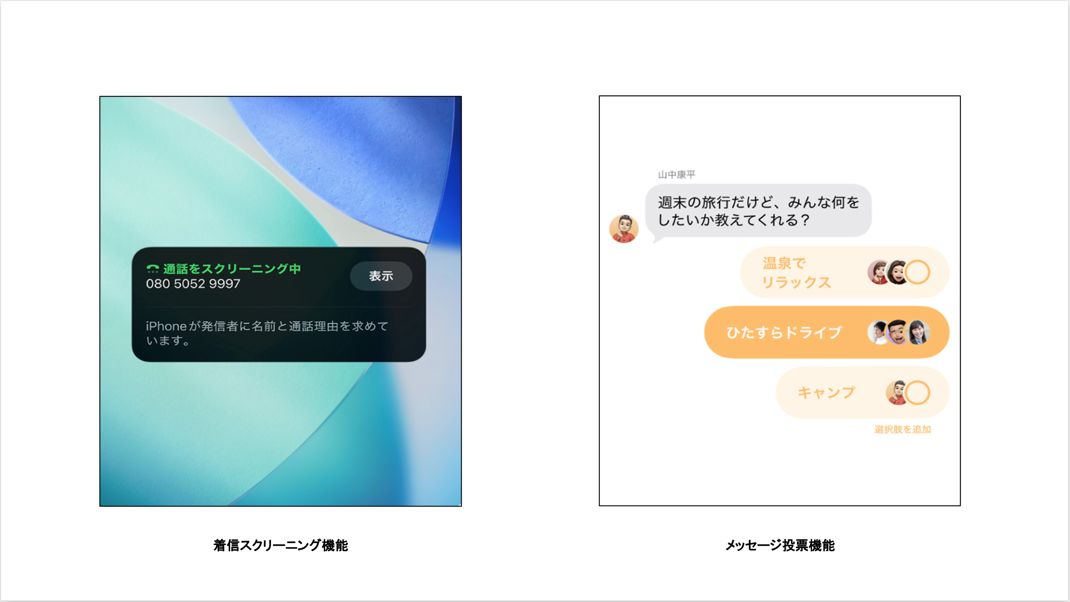 詳細は「iPhoneで通話をスクリーニングする/着信拒否する(Apple社サイト)」「iPhoneの「メッセージ」で投票を行う(Apple社サイト)」をご確認ください。