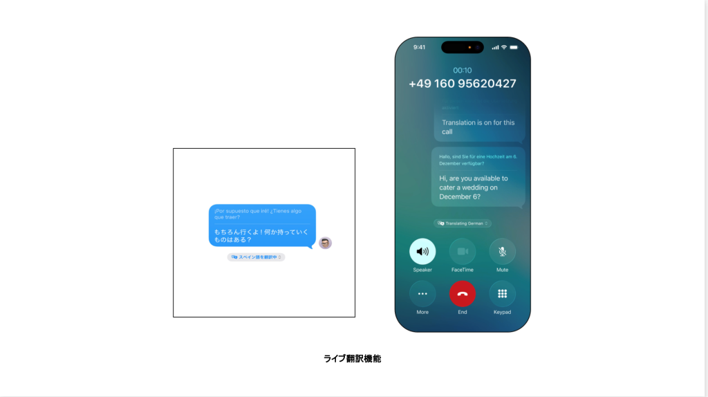 • 概要:メッセージアプリでの自動翻訳に加え、FaceTime で翻訳字幕を表示したり、電話アプリで会話内容を音声で読み上げたりと、シームレスな言語コミュニケーションを実現します。