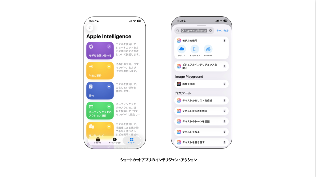 • 概要:ショートカットアプリのインテリジェントアクションでは、テキスト要約や画像生成を自動化し、その結果をショートカットに直接反映できるようになりました。日常の効率化に役立つ新しい可能性を広げます。