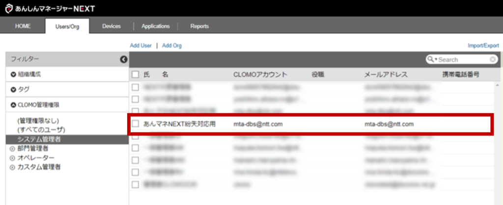 紛失サポート契約中は CLOMO PANEL の Users/Org に「あんマネ NEXT 紛失対応用」という名称の管理者が自動作成されます。