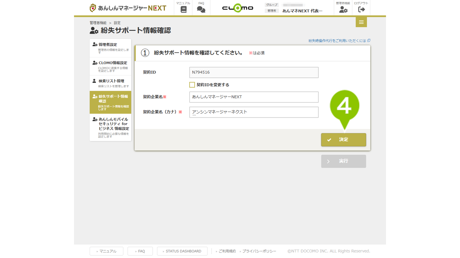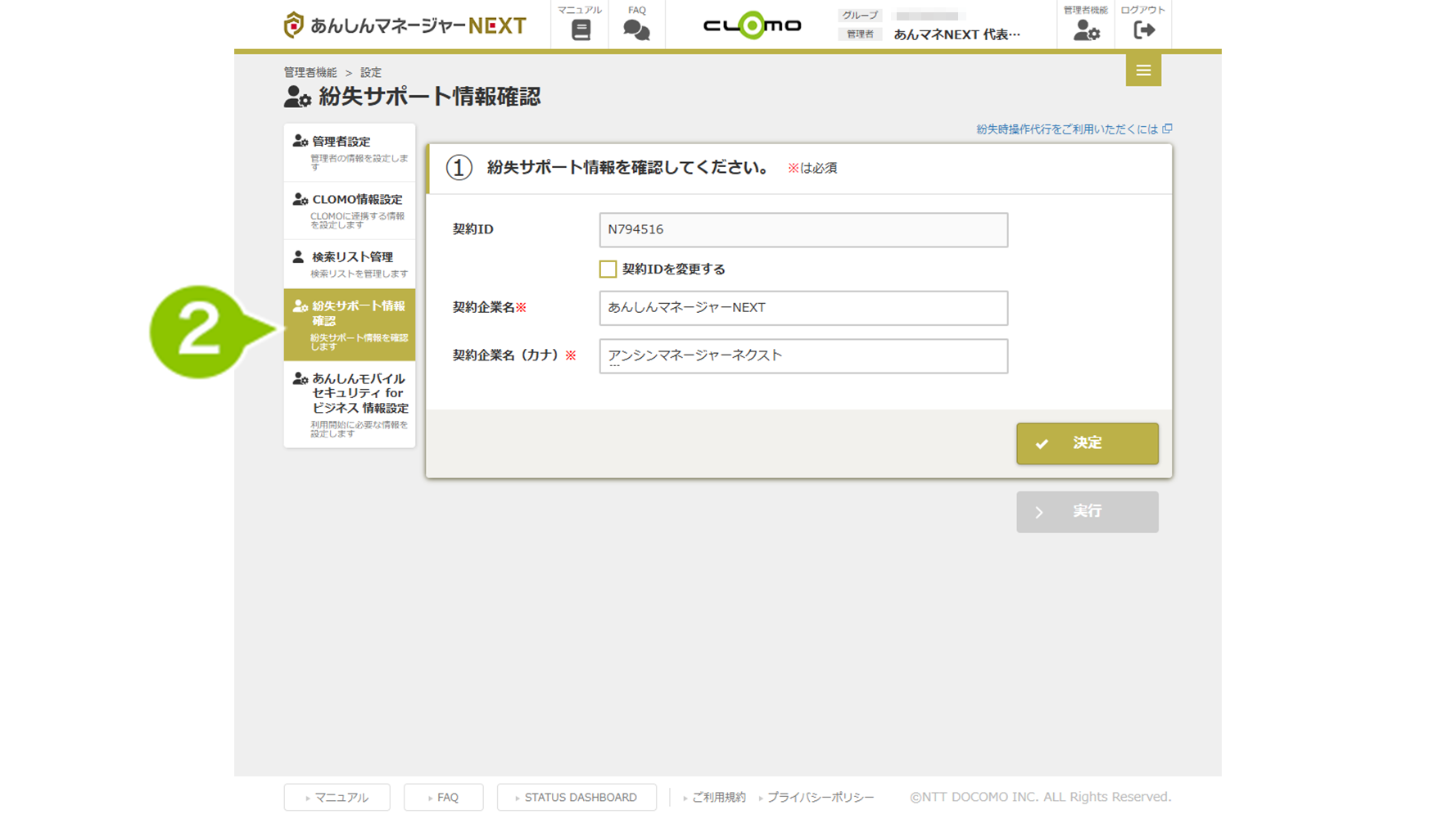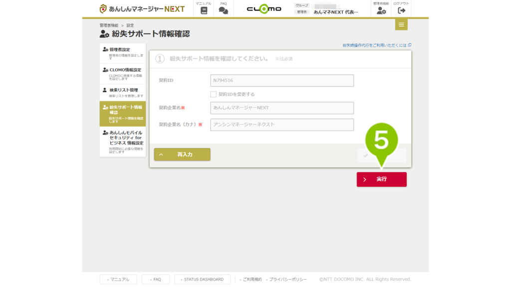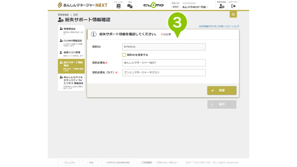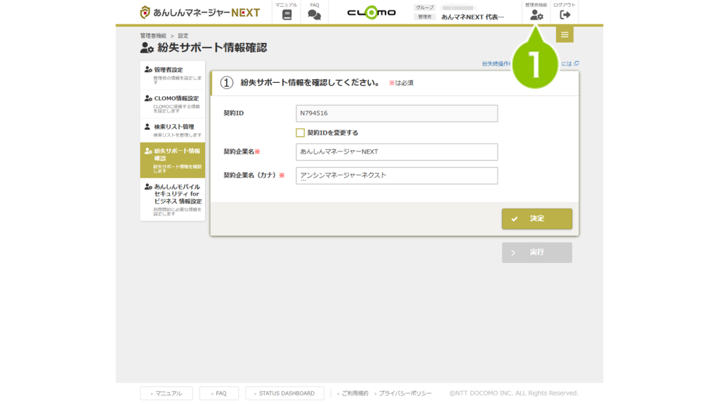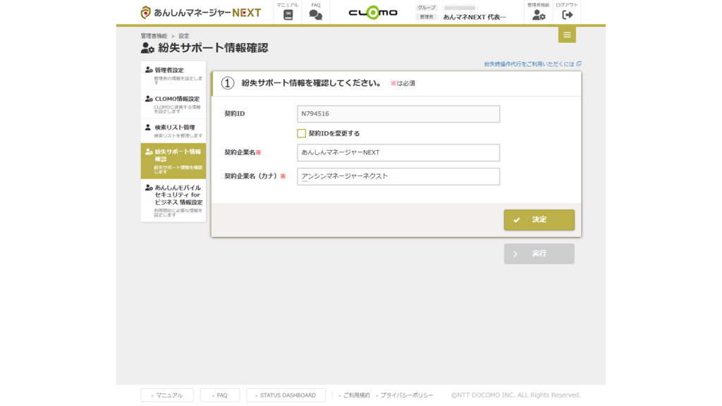 | 契約 ID | 紛失代行操作をご利用の際にサービスデスクにお伝えいただく契約企業IDです。 ※任意の ID に変更することはできません。 |