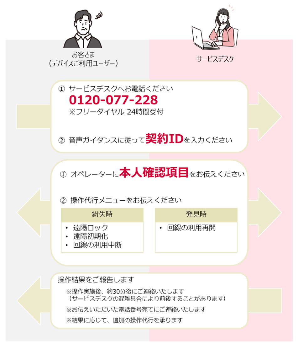 ビジネスサポートパック NEXT のライトプラン/スタンダードプランをご契約いただくとデバイスを紛失した際に、専用のサービスデスクがあんしんマネージャー NEXT の紛失時操作をお客様に代わって実施いたします。