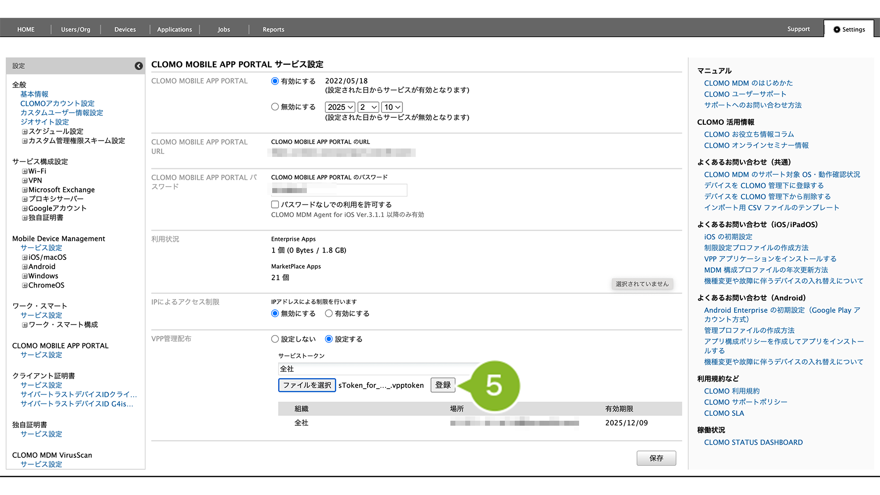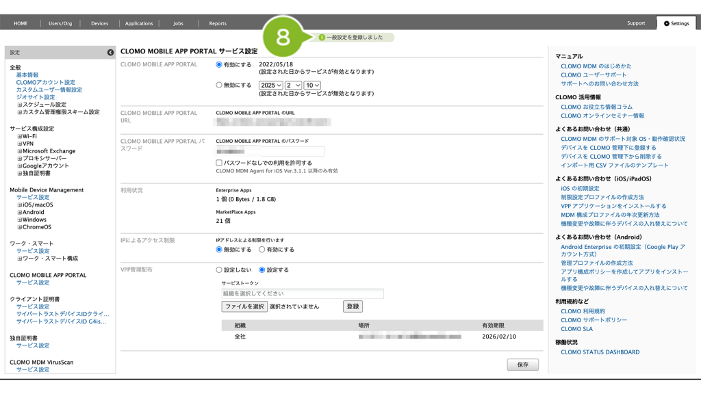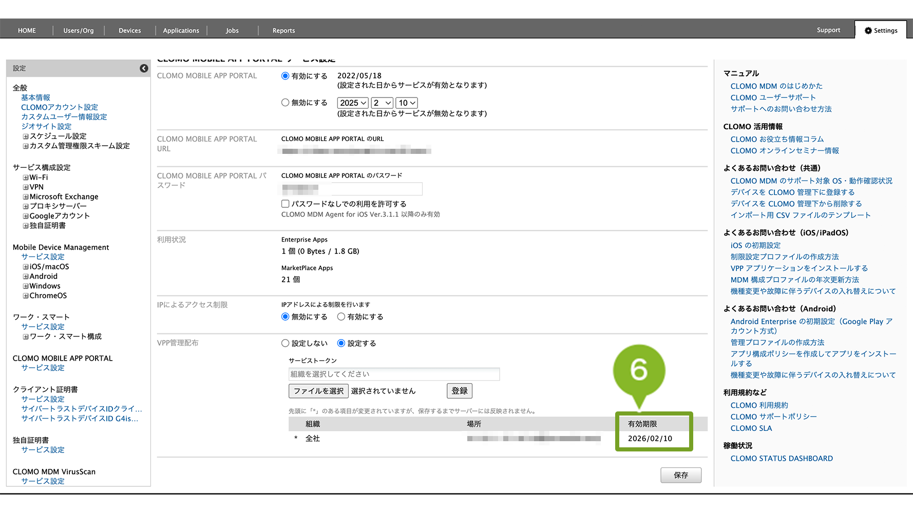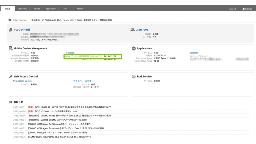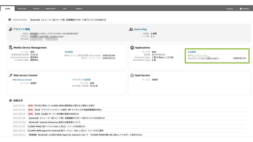 有効期限は CLOMO PANEL の HOME 画面「Applications」欄の「VPPサービストークン」有効期限からも確認することができます。