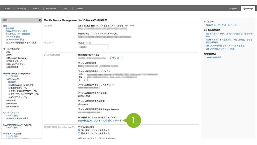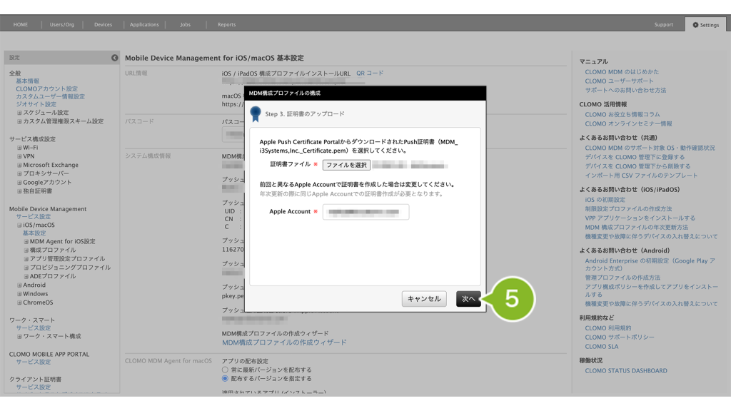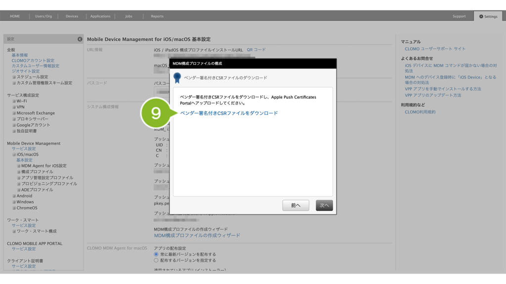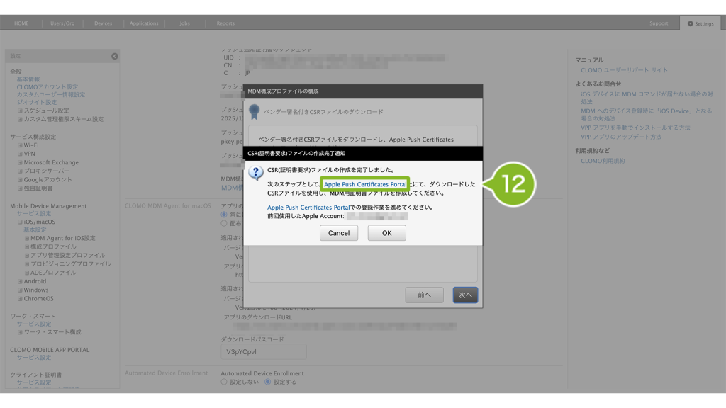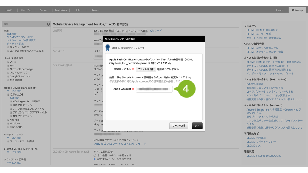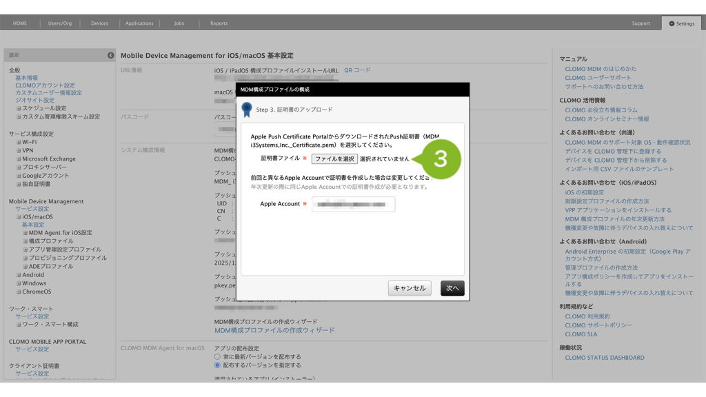 - 1-4-3:Apple Push Certificate Portal(APCP)で作成した証明書ファイルを CLOMO PANEL にアップロードする