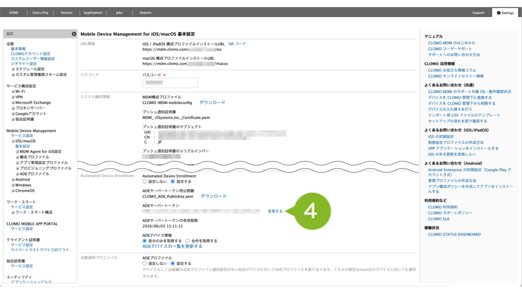 4. Automated Device Enrollment 欄の ADE サーバートークン の[変更する]をクリックします。
